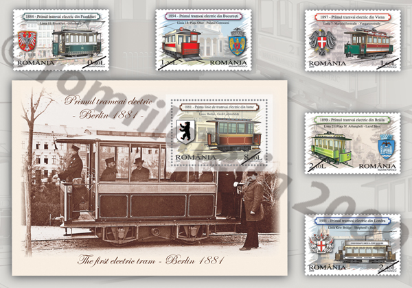 Pe coliţa emisiunii de mãrci poştale cu valoarea nominalã de 8,10 Lei este ilustrat primul tramvai electric din Berlin (1881).