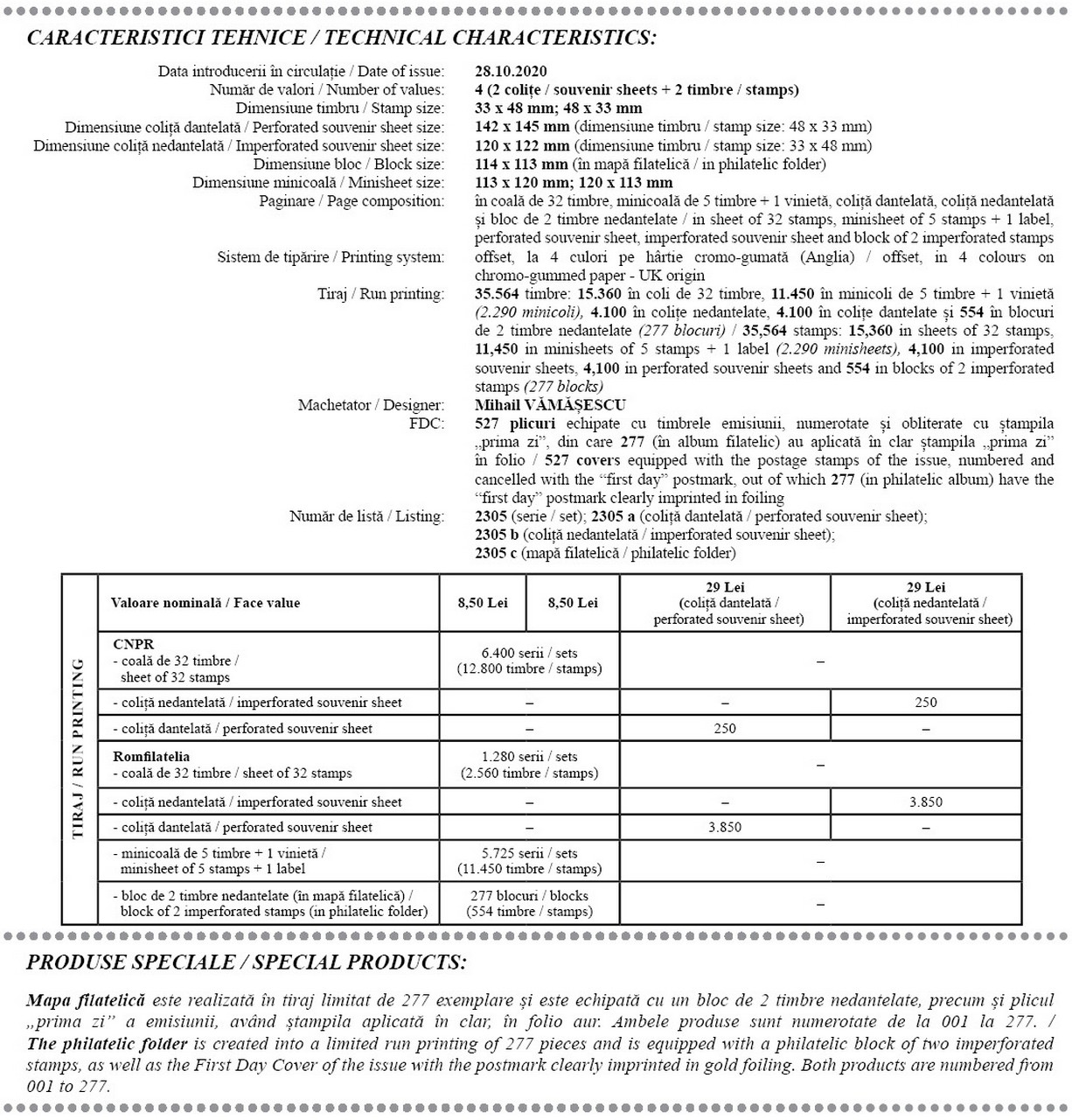 Mapa filatelică este realizată în tiraj limitat de 277 exemplare și este echipată cu un bloc de 2 timbre nedantelate, precum și plicul „prima zi” a emisiunii, având ștampila aplicată în clar, în folio aur. Ambele produse sunt numerotate de la 001 la 277.