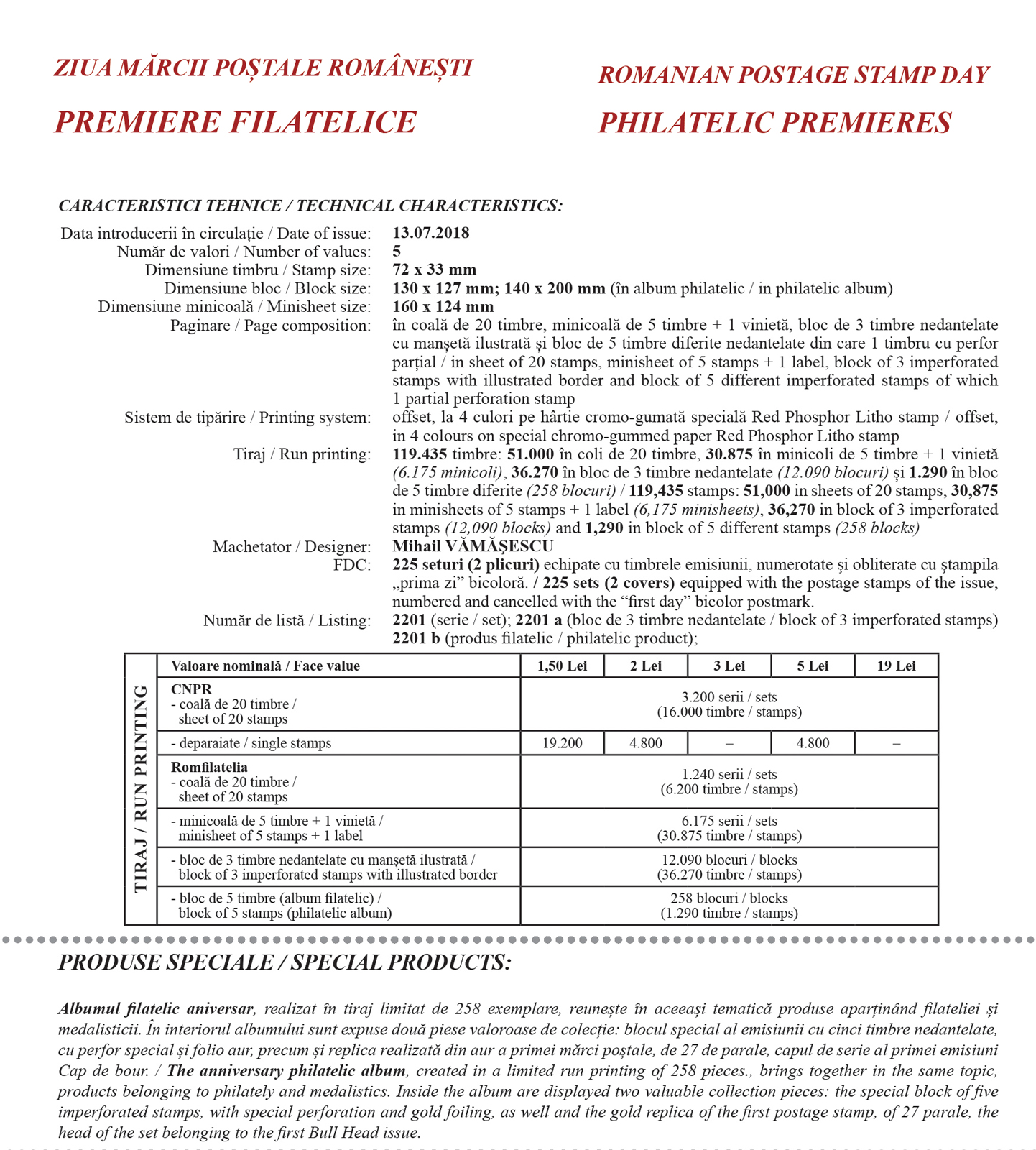 În Anul Centenar al Marii Uniri de la 1918, în contextul aniversării a 160 de ani de la prima emisiune de timbre românești, cunoscută în lista tematicilor sub denumirea de Cap de bour, la care se adaugă alte premiere legate de modul de realizare și prezentare a timbrelor, Romfilatelia introduce în circulaţie emisiunea de mărci poștale Ziua Mărcii Poștale RomâneștiPremiere filatelice.