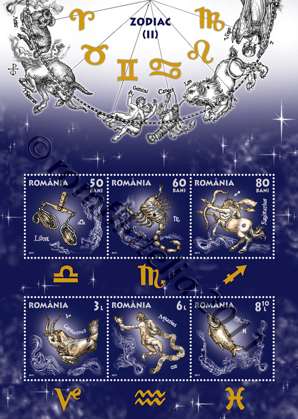 Toate acestea sunt definite pentru fiecare din semnele zodiacale, între care se înscriu şi cele ce constituie tematica emisiunii de mãrci poştale pe care Romfilatelia o introduce în circulaţie intitulatã Zodiac (II) şi care completeazã seria celor 12 zodii, prin prezentarea ultimelor şase.
