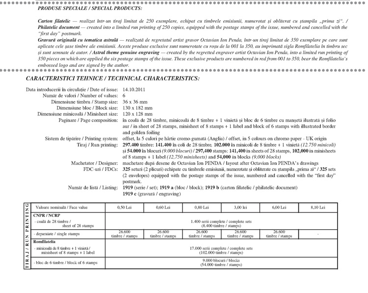 Desenele, ale cãror imagini sunt reproduse pe timbrele emisiunii şi gravura tematicã originalã – un adevãrat testament filatelic – tipãritã în tiraj limitat, cu semnãtura olografã a autorului, aparţin regretatului artist şi gravor Octavian Ion Penda.