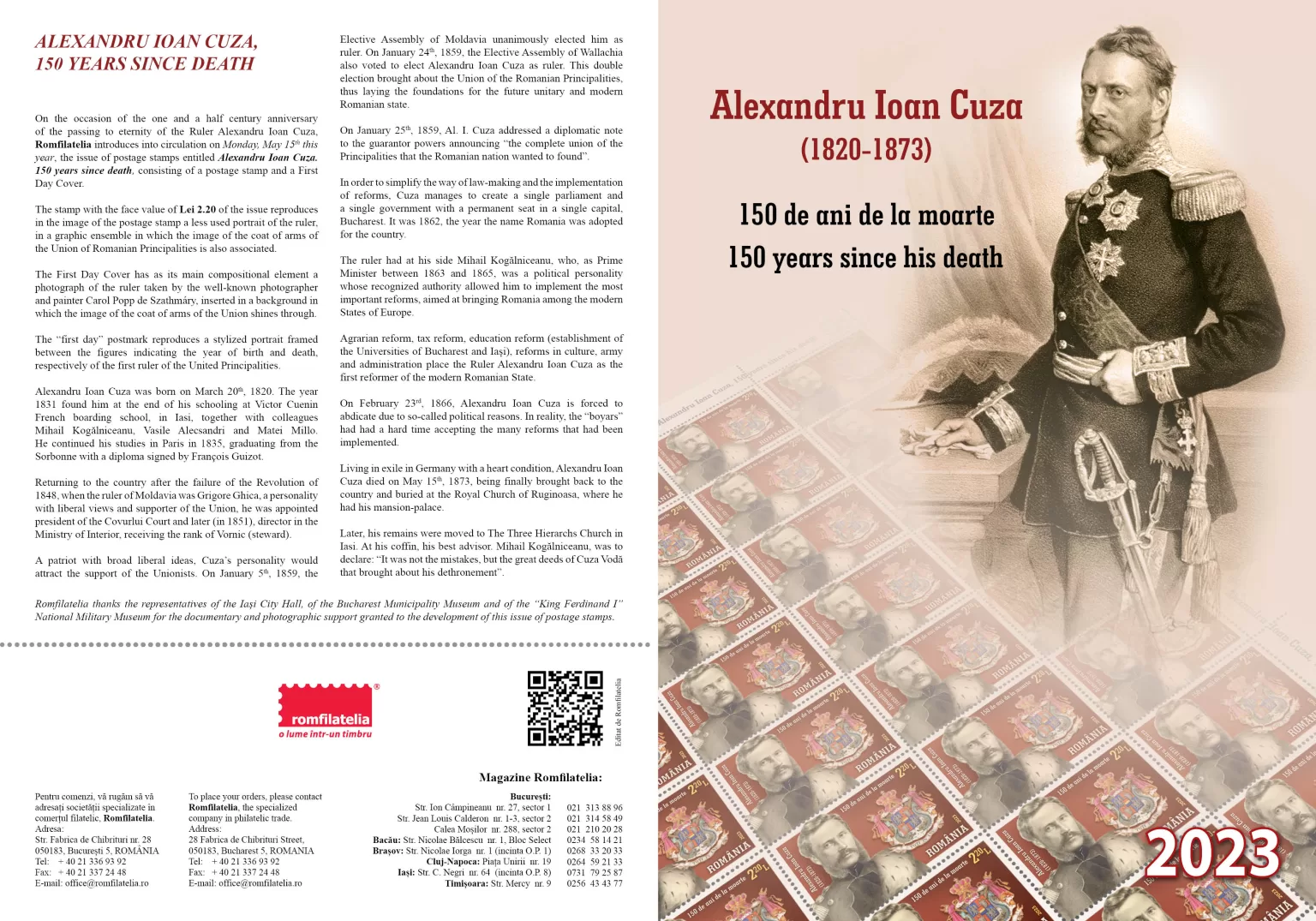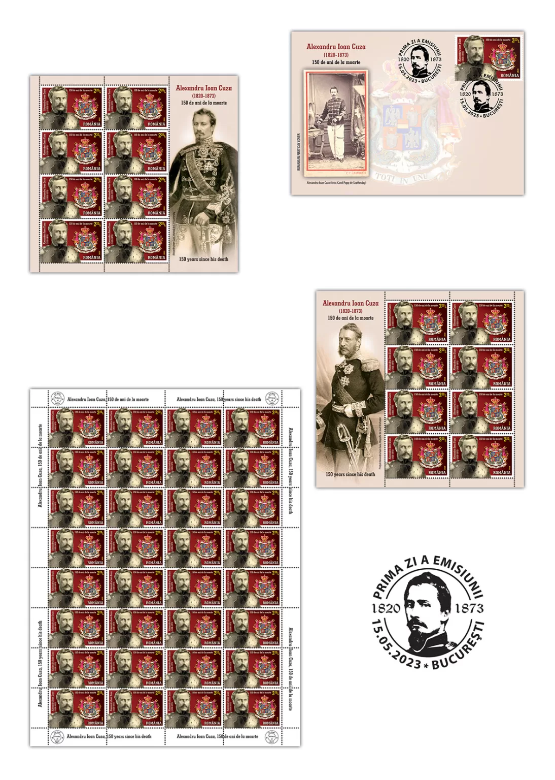 On the occasion of the one and a half century anniversary of the passing to eternity of the Ruler Alexandru Ioan Cuza, Romfilatelia introduces into circulation on Monday, May 15th this year, the issue of postage stamps entitled Alexandru Ioan Cuza. 150 years since death, consisting of a postage stamp and a First Day Cover.