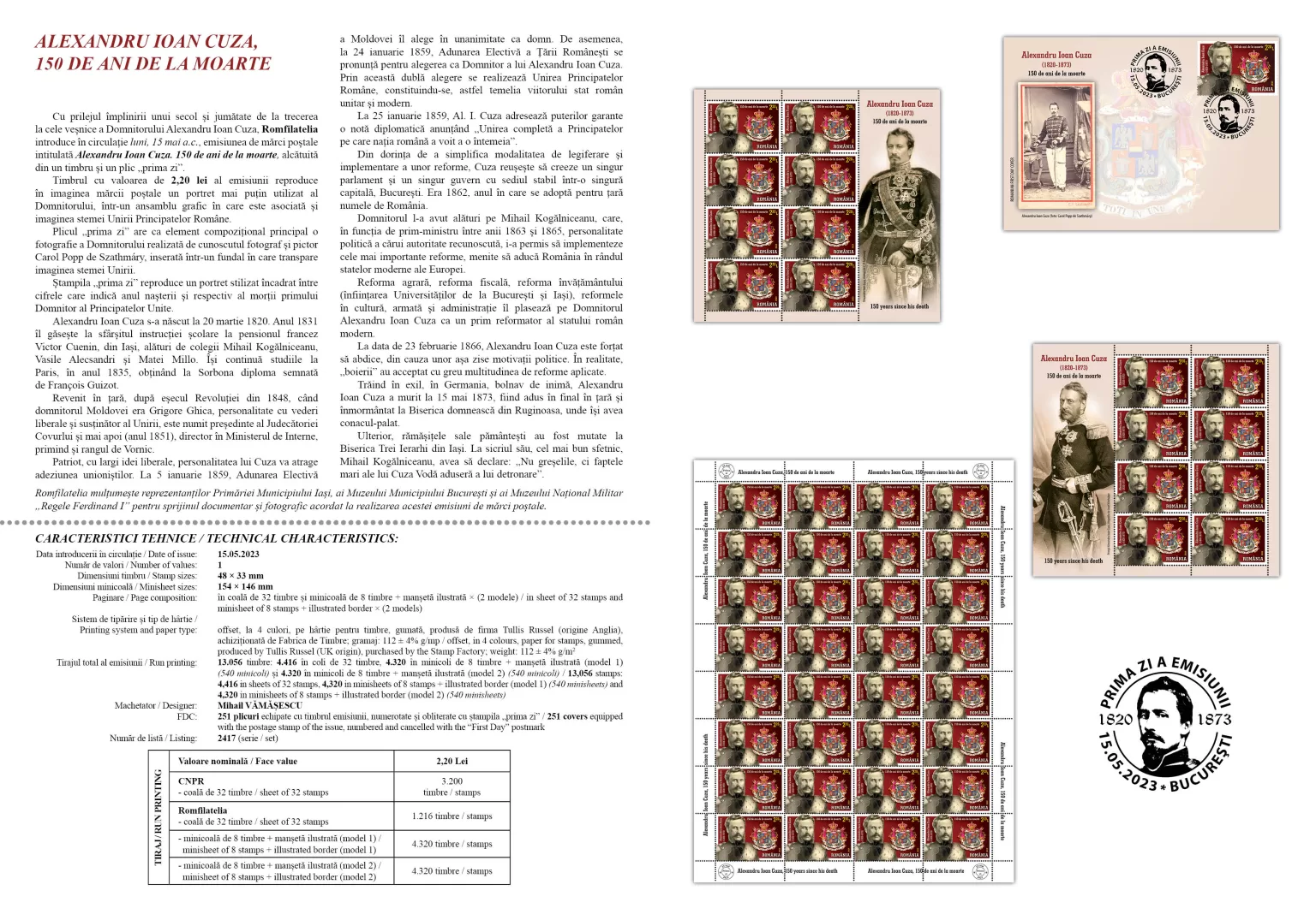 The philatelic issue will be available starting with Monday, May 15th, 2023, in Romfilatelia’s shops network in Bucharest, Bacău, Brașov, Cluj-Napoca, Iași and Timișoara and online on https://romfilatelia.ro/store/.
