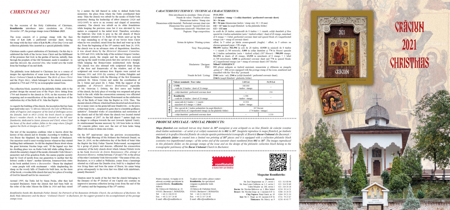 The postage stamps issue “Christmas 2021” will be available on Friday, 19th of November 2021, in Romfilatelia’s shops network in Bucharest, Bacau, Brasov, Cluj-Napoca, Iasi and Timisoara and online on https://romfilatelia.ro/store/.