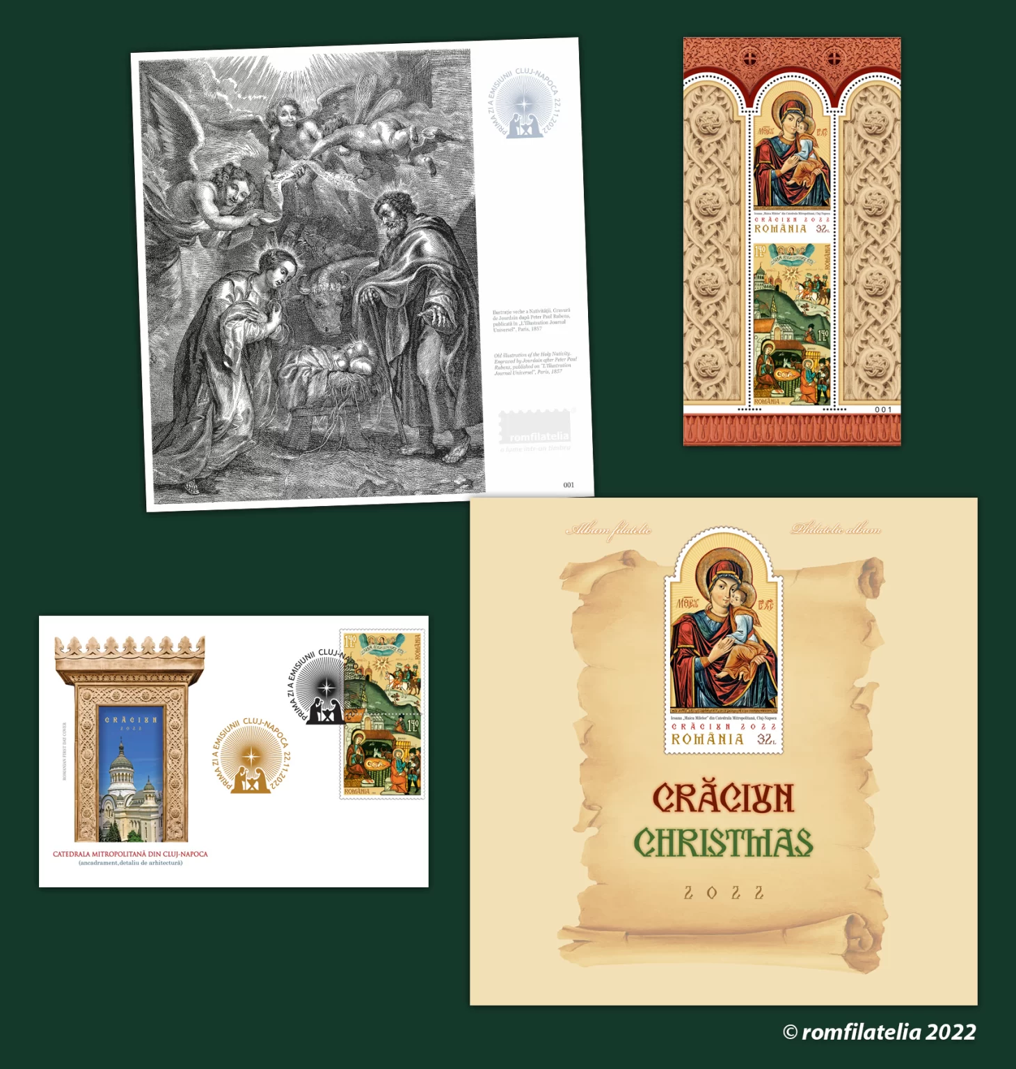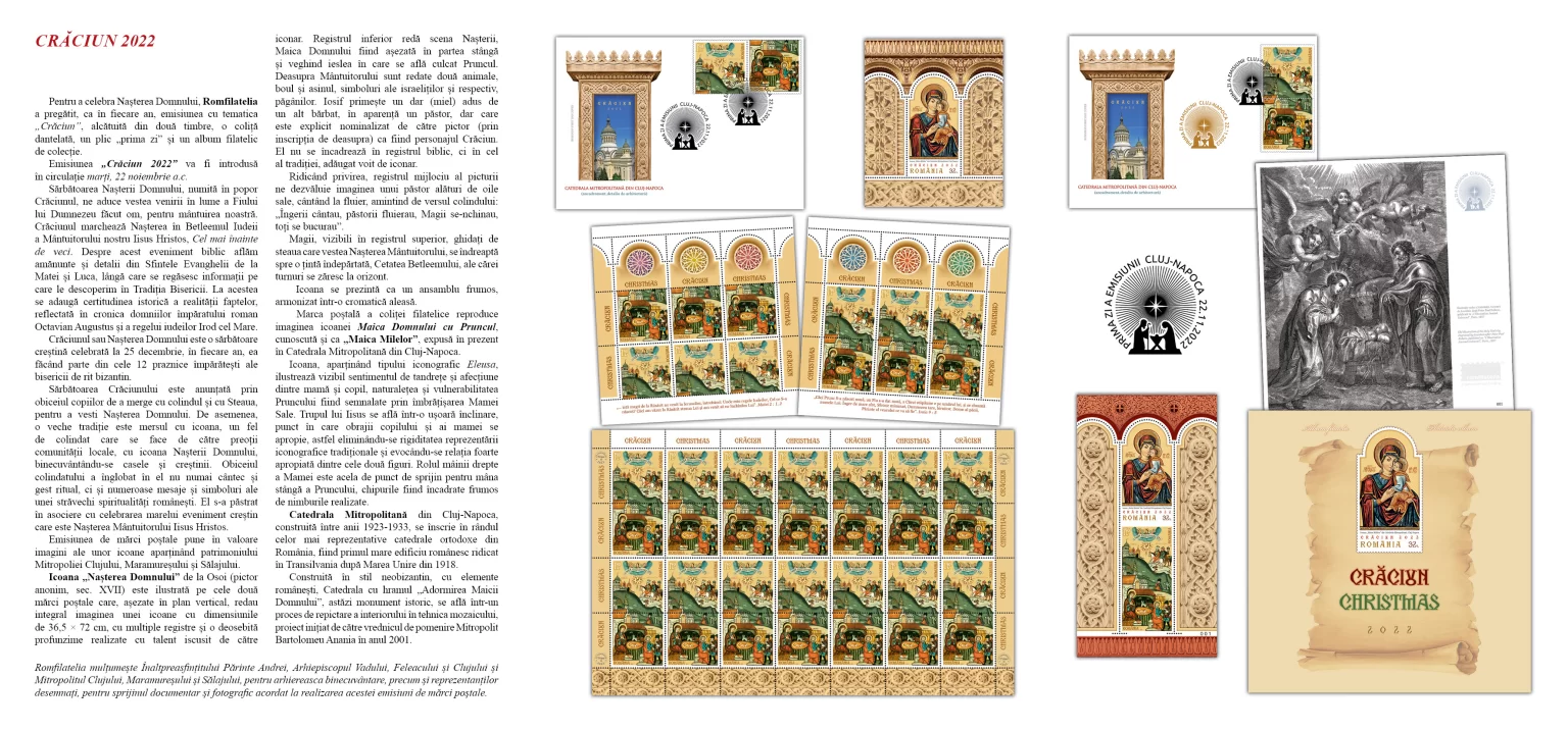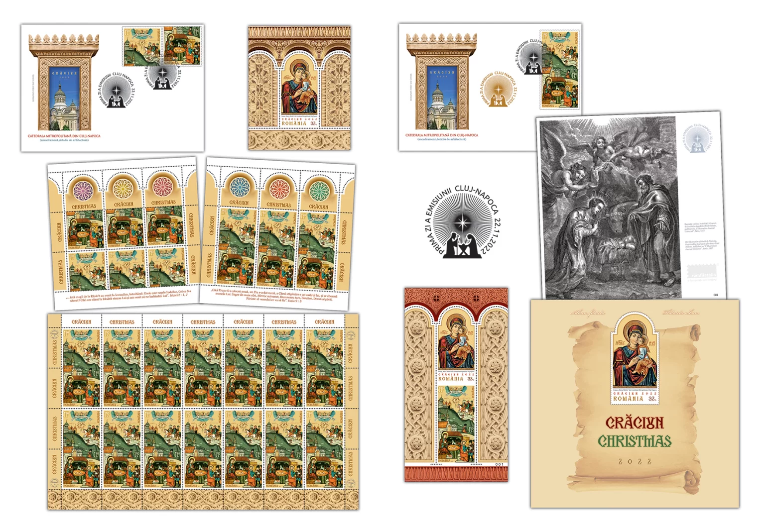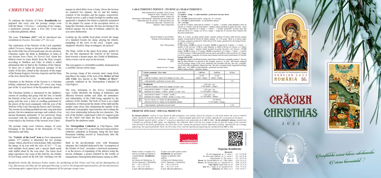 To celebrate the Nativity of Christ, Romfilatelia has prepared, like every year, the postage stamps issue with the theme “Christmas”, consisting of two stamps, a perforated souvenir sheet, a First Day Cover and a collection philatelic album.