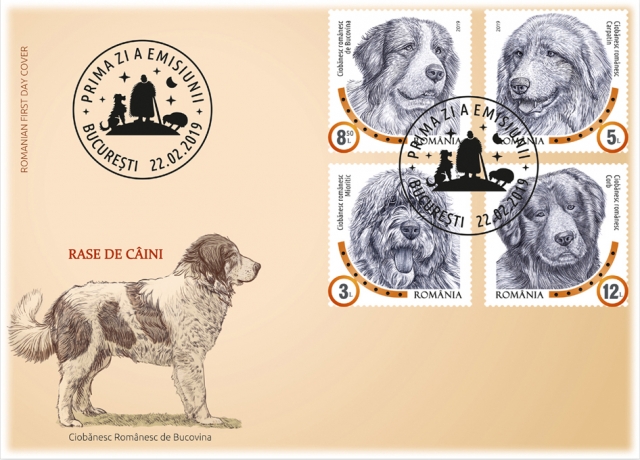 The postage stamp issue Dog Breeds will be available on Friday, February 22th 2019, in Romfilatelia’s shops network in Bucharest, Bacau, Brasov, Cluj-Napoca, Iasi and Timisoara and online on https://romfilatelia.ro/store/. The postage stamp issue is completed by one “first day” cover, as page composition in sheet of 28 stamps and minisheet of 5 stamps, 1 vignette and block of 4 non-perforation stamps of issue with perforated graphic detail.