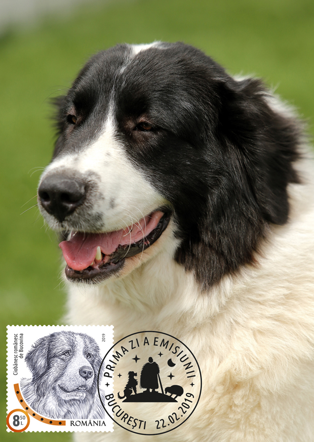 On the stamp with the face value of Lei 8.50 is presented the Romanian Bucovina Shepherd Dog, a natural breed originating in the area of the Carpathians, north-eastern Romania, in Bukovina region. The breed has received special attention in terms of selection and improvement, which have led to the existence of the actual type.