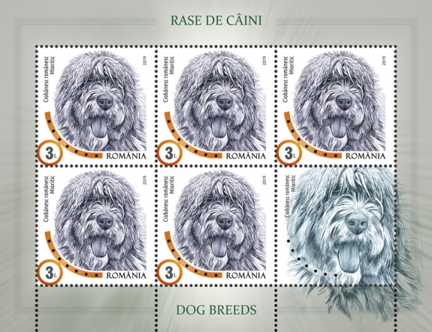 The Romanian Mioritic Shepherd Dog, represented on the stamp with the face value of Lei 3, was selected from a natural breed existing in the Carpathian Mountains, the main reason being the utility. Due to its large size, a well-developed body and its vigorous and spectacular appearance, this breed is highly appreciated in Romania.