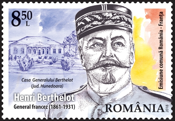 En cette année du Centenaire de la Grande Union, Romfilatelia marque les relations cordiales entre la Roumanie et la France – un pays qui nous a soutenus dans tous les moments importants de l’histoire – par l’émission commune de timbres Le Général Berthelot, sur le front roumain. L’émission est composée de deux timbres, un pour chaque pays. Sur le timbre de la Roumanie ayant la valeur faciale de 5 lei est reproduite une photo du front où le général Berthelot décore un groupe d’officiers roumains à Onesti. Sur le timbre de la France ayant la valeur faciale de 8.50 lei se trouve le portrait d’Henri Mathias Berthelot avec à l’arrière-plan l’esquisse du manoir du département de Hunedoara qui a appartenu au général. L’émission philatélique dédiée au général Berthelot ouvre la Saison culturelle Roumanie-France (le 27 novembre 2018 – le 14 juillet 2019).