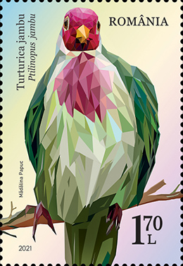 The stamp with the face value of Lei 1.70 presents the jambu fruit dove (Ptilinopus jambu). It lives in Thailand, Malaysia, and Brunei and on several of the islands of the Indonesian Archipelago. It is 23-27 cm long. This is a shy bird difficult to observe as it stays hidden among the leaves of the trees where its green colour allows it to camouflage. It eats mainly fruits. Since it lives in forests, it is affected by the massive deforestation taking place in its habitat and it is been considered an near endangered species.