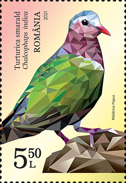 The stamp with the face value of Lei 5.50 presents the common emerald dove (Chalcophaps indica), a species native to the tropical and subtropical regions of South-East Asia and the Indian subcontinent. It is 23-27 cm long. It feeds on seeds and fruits coming from a diverse range of plants, and it is frequently encountered in lowland forests and mangroves, as well as in gardens, on farms and plantations.