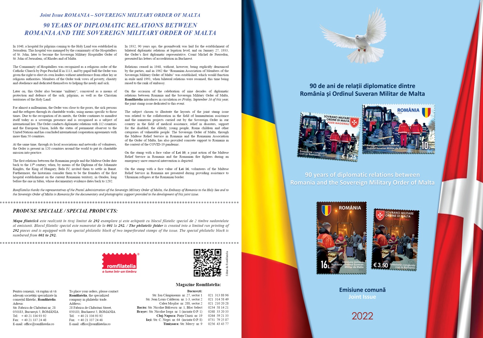 Romfilatelia thanks the representatives of the Postal Administration of the Sovereign Military Order of Malta, the Embassy of Romania to the Holy See and to the Sovereign Order of Malta in Romania for the documentary and photographic support provided to the development of this joint issue.