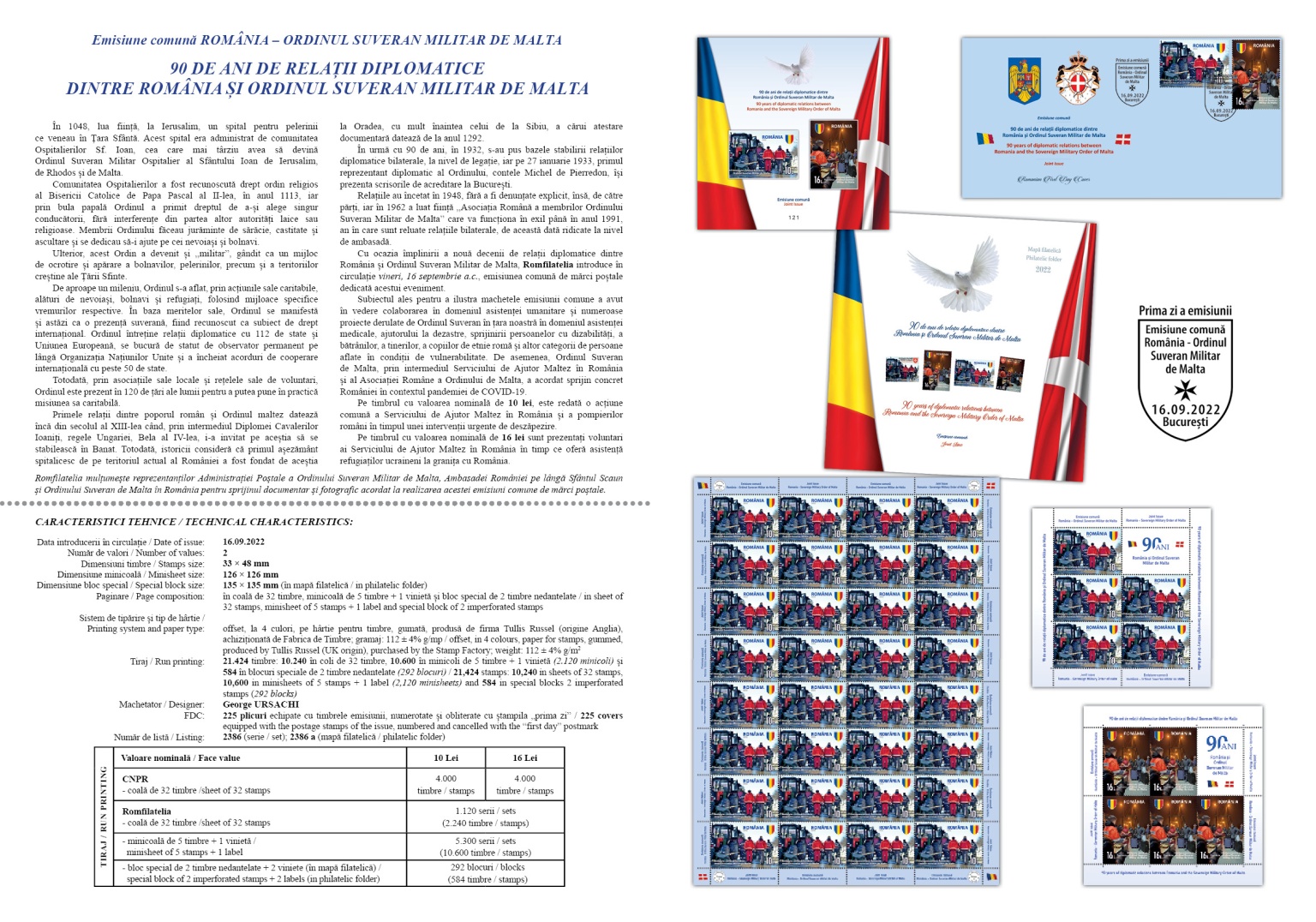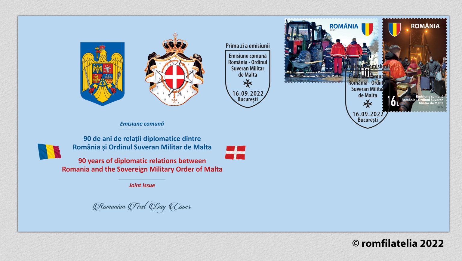 On the occasion of the celebration of nine decades of diplomatic relations between Romania and the Sovereign Military Order of Malta, Romfilatelia introduces in circulation on Friday, September 16 of this year, the joint stamp issue dedicated to this event.