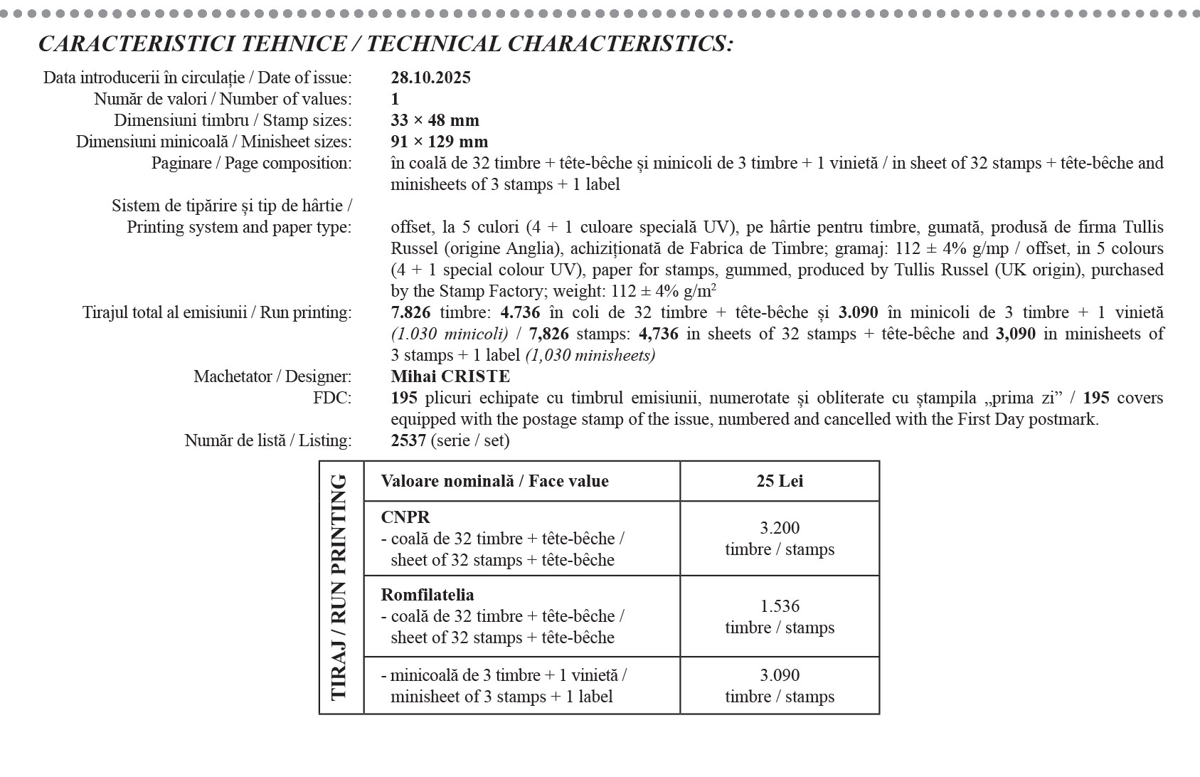 Romfilatelia extends its thanks to Academician Marius Andruh, Vice President of the Romanian Academy, for the documentary support provided for the development of this postage stamp issue.
