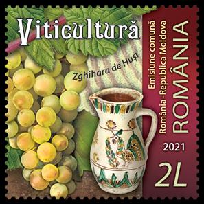 The stamp with a face value of lei 2 brings together in a unitary graphic the image of a painted cup that was made by the craftsman Colibaba Constantin, in the Radauti Urban Workshop, Suceava County, and of a bunch of Zghihara grapes from Husi region, Romania.