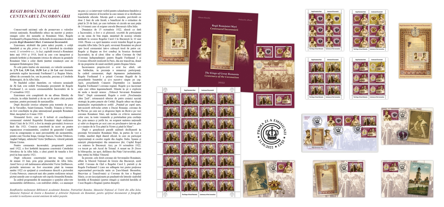 Romfilatelia continues its mission of promoting the values of national history and introduces into circulation the anniversary philatelic issue of The Kings of Great Romania. Centenary of the Coronation, a reference moment in the history of Romania.