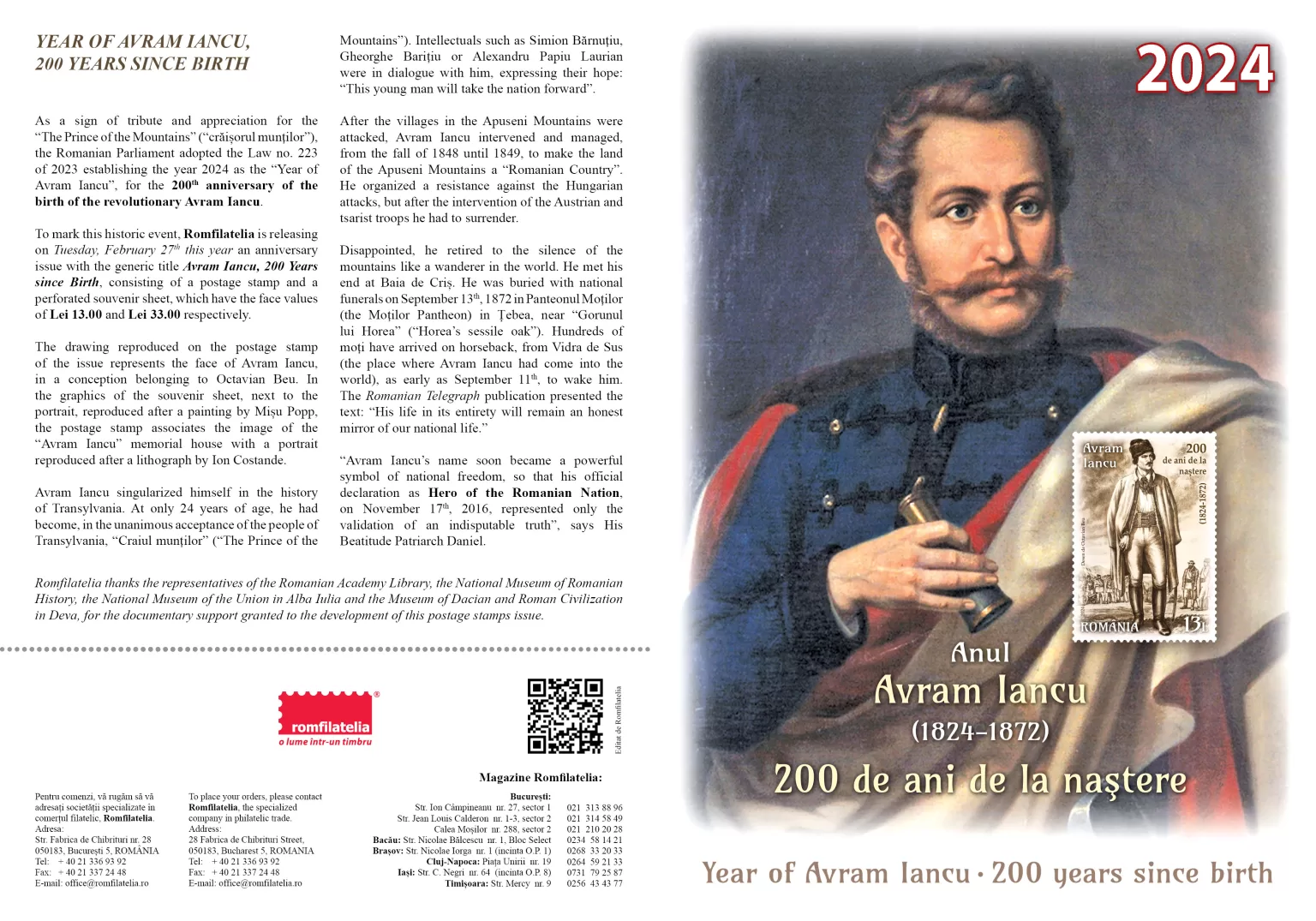 Emisiunea va fi disponibilă de marți, 27 februarie în rețeaua magazinelor Romfilatelia din București, Bacău, Brașov, Cluj-Napoca, Iași, Timișoara, precum și în magazinul nostru online: https://romfilatelia.ro/store/