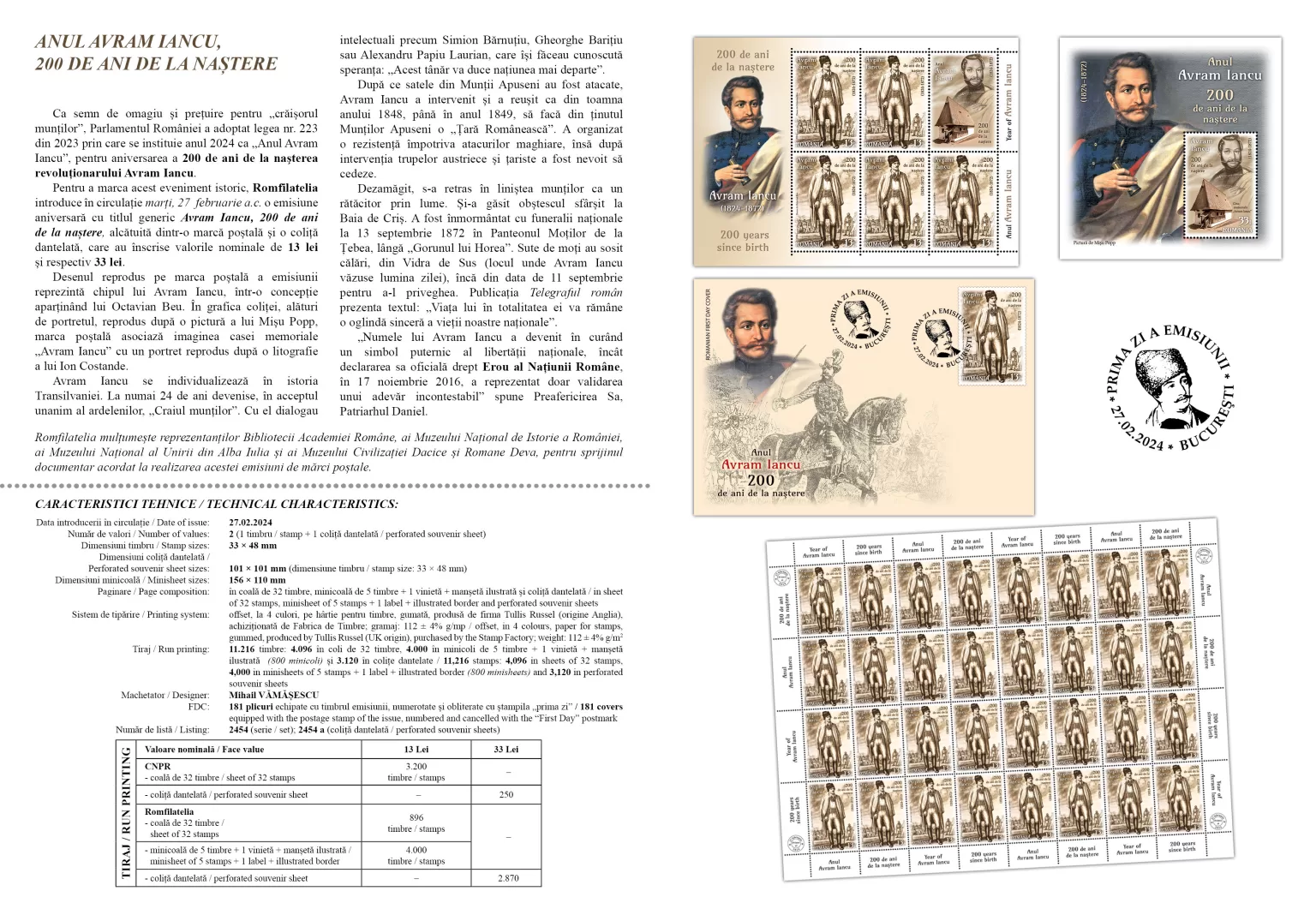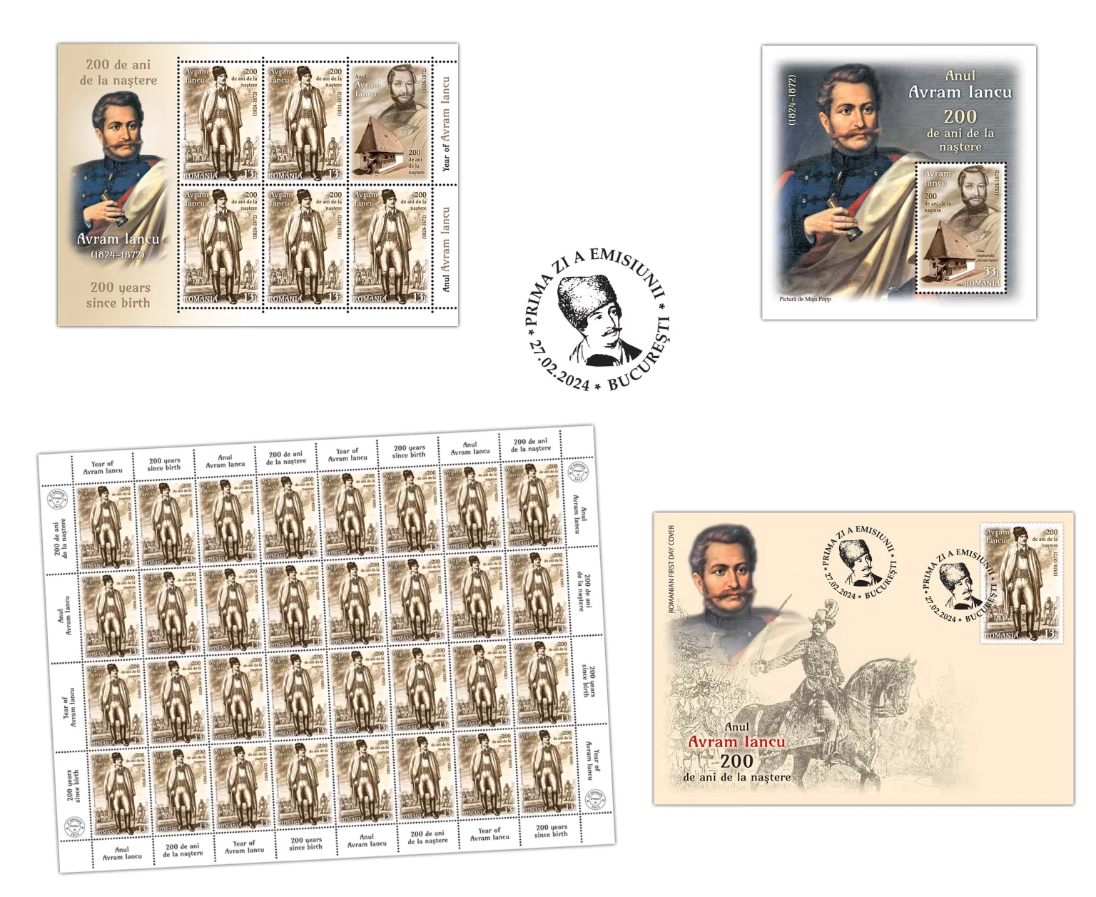 Pentru a marca acest eveniment istoric, Romfilatelia introduce în circulație marți, 27 februarie a.c. o emisiune aniversară cu titlul generic Avram Iancu, 200 de ani de la naștere, alcătuită dintr-o marcă poștală și o coliță dantelată, care au înscrise valorile nominale de 13 lei și respectiv 33 lei.