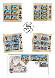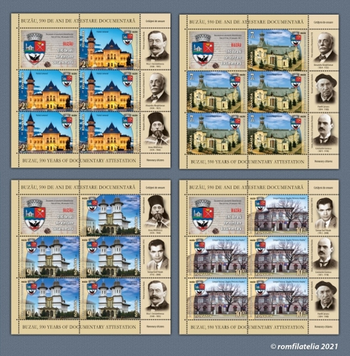 Emisiunea de mărci poștale aniversară dedicată Buzăului reproduce în imaginile sale patru monumente arhitectonice reprezentative legate strâns de istoria, cultura și viața socială a orașului.