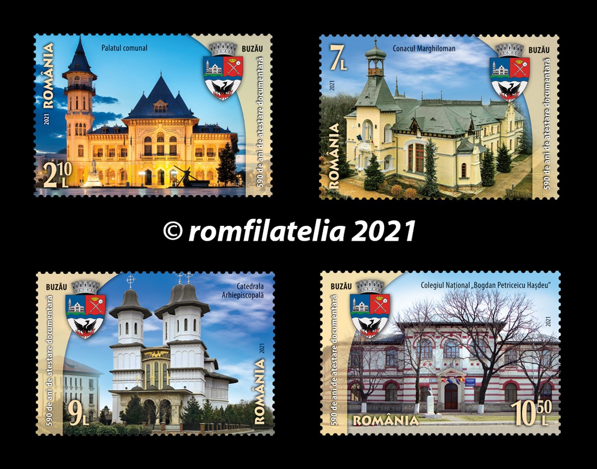 Romfilatelia introduce în circulație marți, 23 februarie a.c., o emisiune de mărci poștale tematică din seria Orașele României, intitulată Buzău, 590 de ani de atestare documentară.