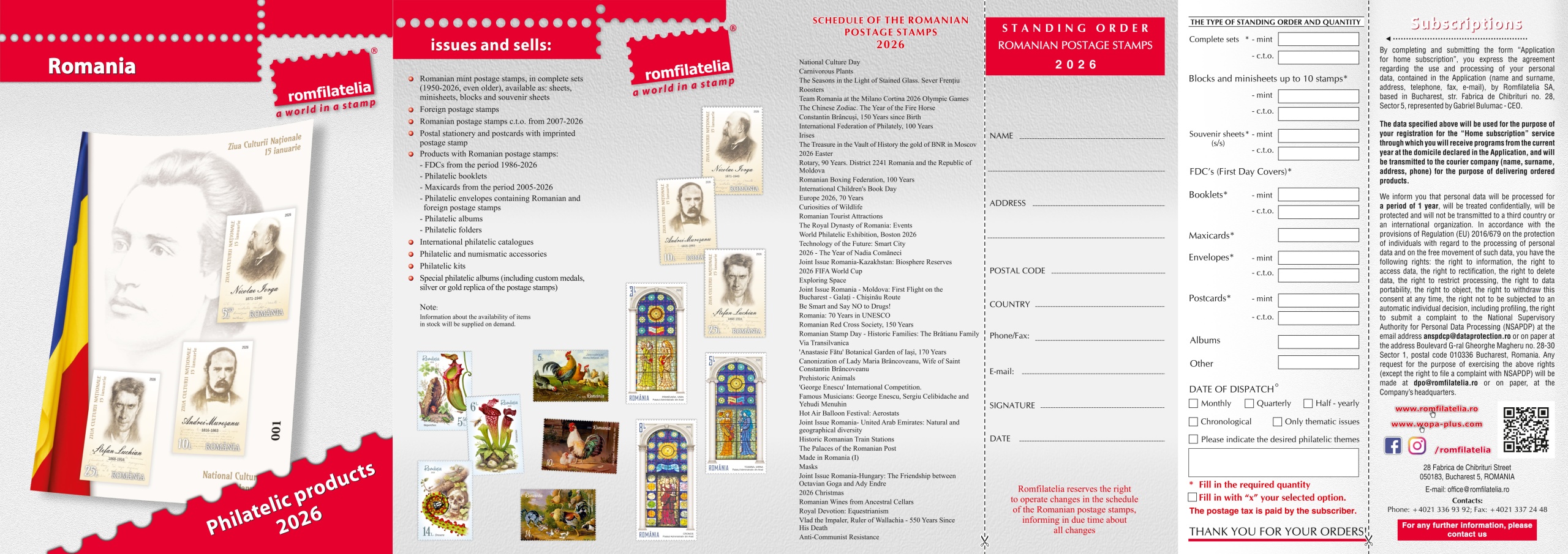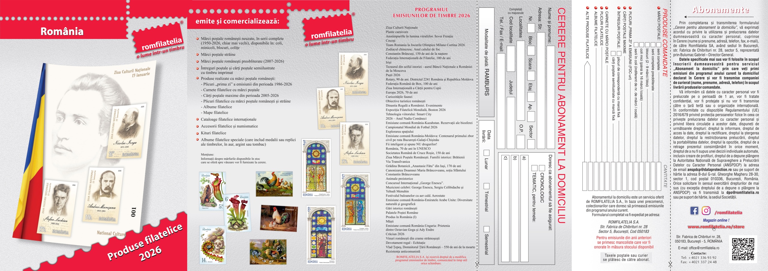 Abonamentul la domiciliu este un serviciu oferit de ROMFILATELIA S.A., în baza unei precomenzi, colecţionarilor care doresc să primească emisiunile din programul anului curent.
