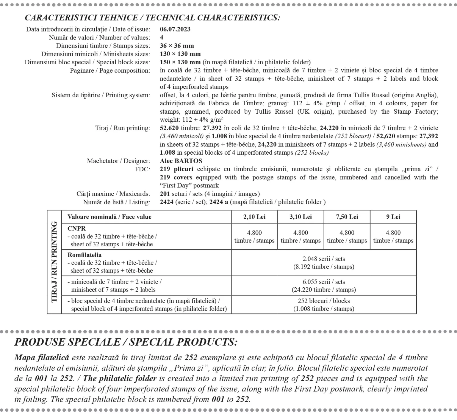 Emisiunea va fi disponibilă de Joi, 06 iulie, în rețeaua magazinelor Romfilatelia din București, Bacău, Brașov, Cluj-Napoca, Iași, Timișoara, precum și în magazinul nostru online: https://romfilatelia.ro/store/.
