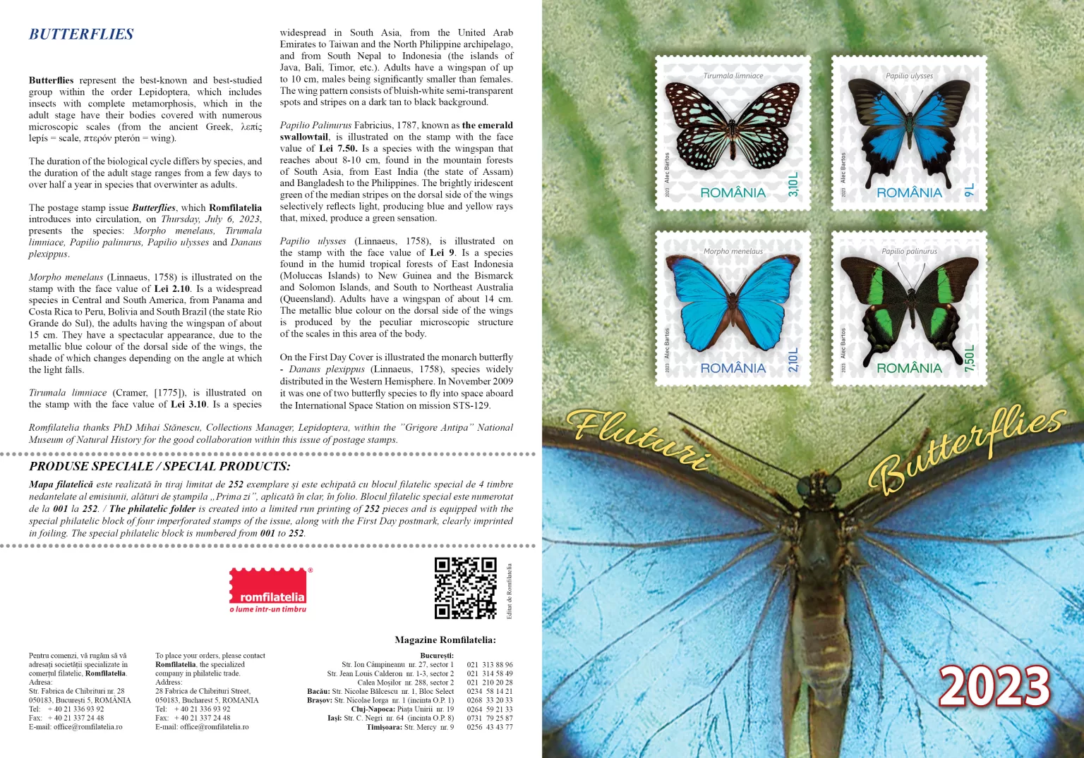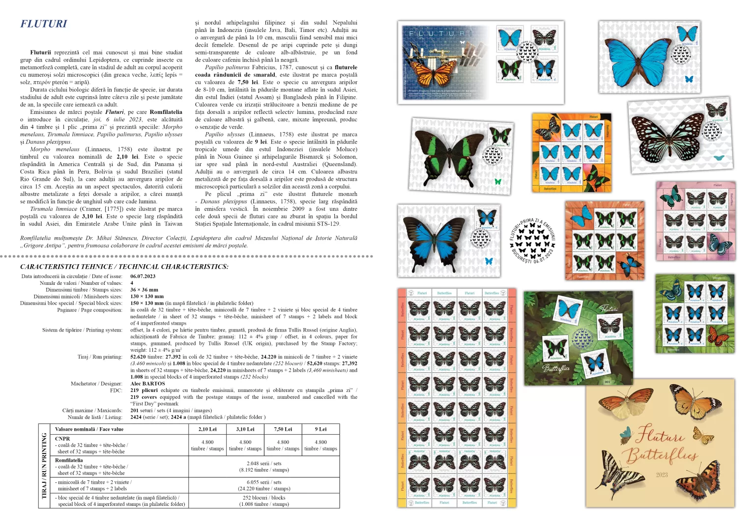 Emisiunea de mărci poştale Fluturi, pe care Romfilatelia o introduce în circulaţie, joi, 6 iulie 2023, este alcătuită din 4 timbre și 1 plic „prima zi” și prezintă speciile: Morpho menelaus, Tirumala limniace, Papilio palinurus, Papilio ulysses și Danaus plexippus.