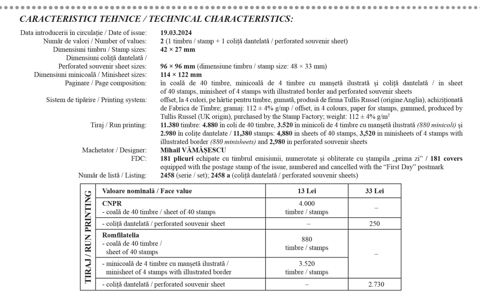 Emisiunea va fi disponibilă de marți, 19 martie, în rețeaua magazinelor Romfilatelia din București, Bacău, Brașov, Cluj-Napoca, Iași, Timișoara, precum și în magazinul nostru online: https://romfilatelia.ro/store/.