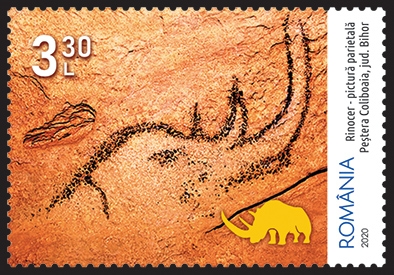 Pe timbrul cu valoarea nominală de 3,30 lei este reprodusă o pictură parietală din Peștera Coliboaia (județul Bihor), în care poate fi vizualizat un rinocer lânos – Coelodonta antiquitatis (Blumenbach, 1799), iar pictura datează de cca. 33.000 de ani, una dintre cele mai vechi reprezentări rupestre din Europa.