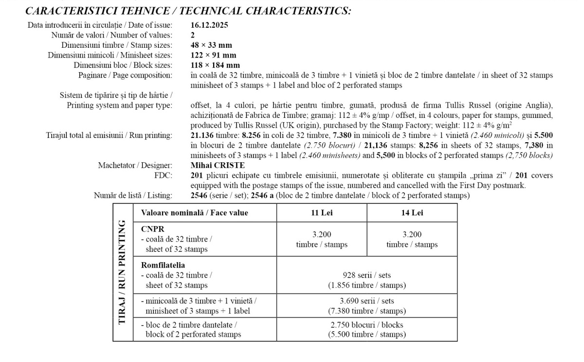 Emisiunea are în componența sa două mărci poștale, un bloc filatelic de 2 timbre dantelate și un plic „prima zi”.