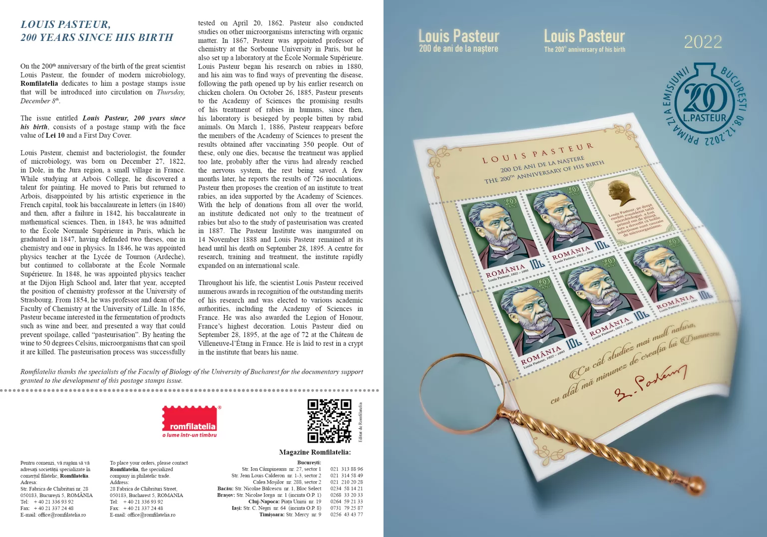 Considerând rolul mărcii poştale ca un element cu valoare de simbol prin care se pot transimte cu uşurinţă şi rapiditate mesaje care ajung la public într-o manieră creativă şi mereu originală, Romfilatelia introduce în circulaţie joi, 8 decembrie a.c. emisiunea aniversară dedicată lui Louis Pasteur la 200 de ani de la naştere.