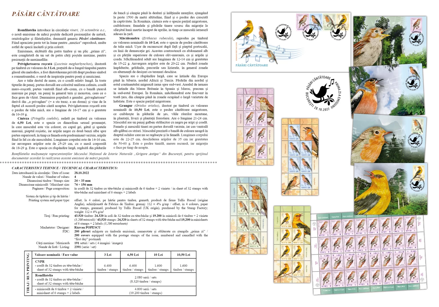 Romfilatelia introduce în circulație vineri, 28 octombrie a.c., o nouă emisiune de mărci poștale dedicată pasionaților de natură, ornitologilor și filateliștilor, denumită generic Păsări cântătoare. Fiind apreciate peste tot în lume pentru „muzica” reprodusă, multe astfel de specii încântă și prin colorit.