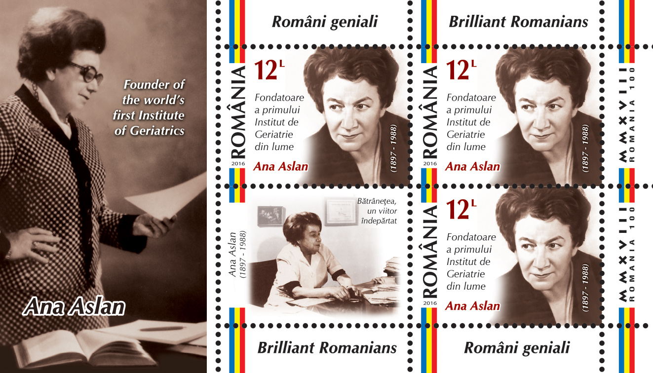 De asemenea, a fost prezentată și emisiunea de mărci poștale „Români geniali„, prin intermediul căreia, în anul 2016, Romfilatelia a promovat personalităţi româneşti de marcă, amintind în cadrul întâlnirii de Ana Aslan, institutul care actualmente îi poartă numele fiind deseori catalogat ca „Perlă a Coroanei”.
