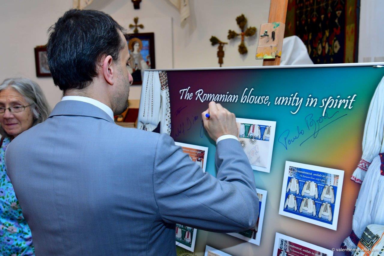 Doamna Cristina Popescu, Director General Romfilatelia, a prezentat elementele emisiunii, menționând rolul mărcii poștale ca simbol național, alături de imn, steag, emblemă și monedă, timbrele reprezentând un prilej, pentru comunitatea românească și nu numai, de a transmite mesaje de suflet celor dragi. A continuat prin a mulțumi reprezentanților instituțiilor partenere pentru evenimentul organizat, invitându-i să dezvelească panoul emisiunii Ia românească, unitate în spirit.