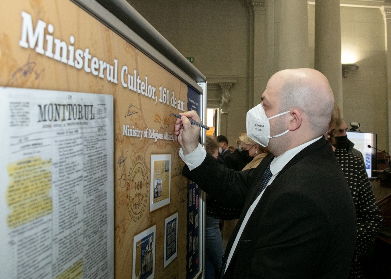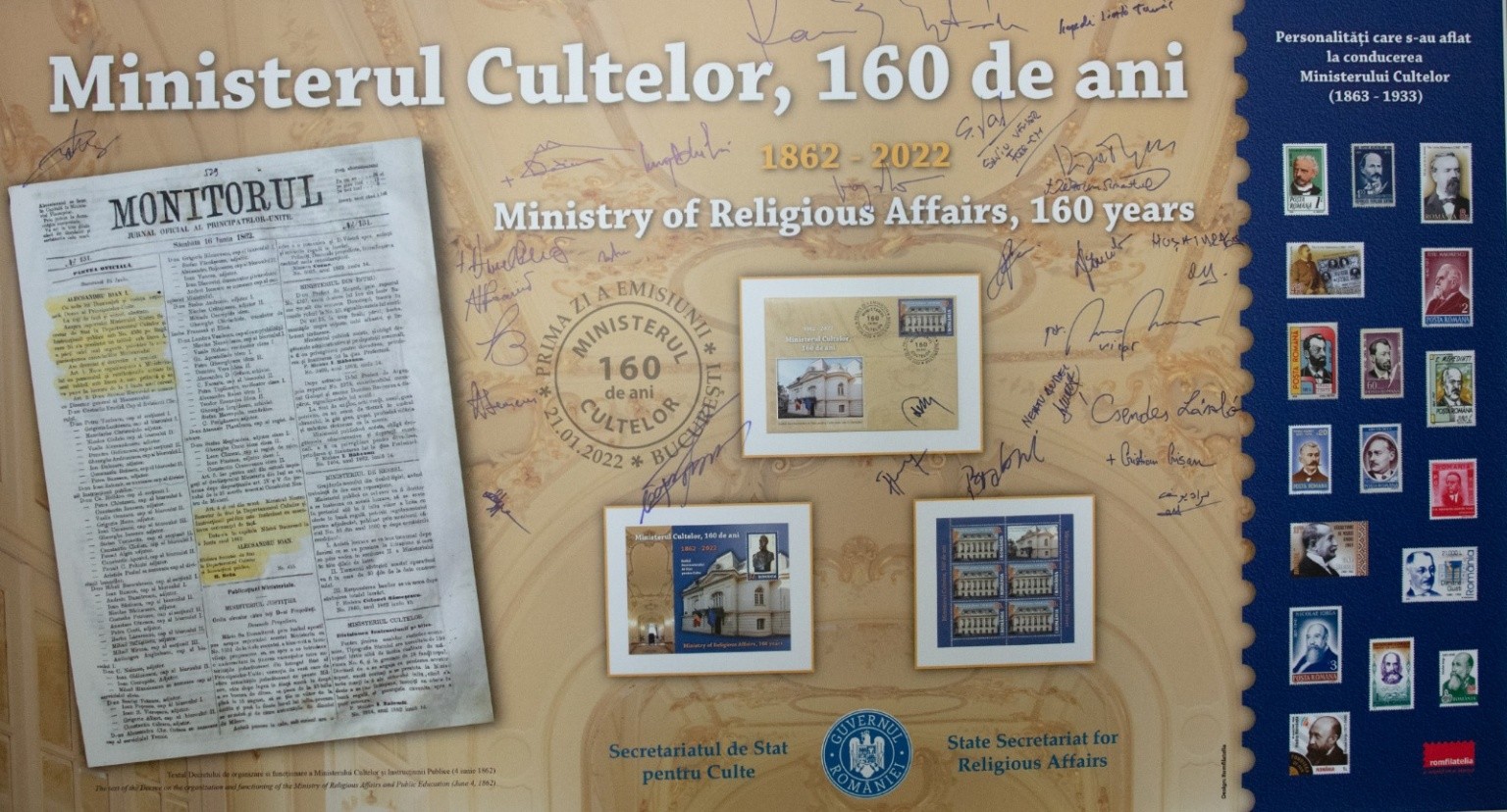 Romfilatelia, în calitate de partener instituțional al Academiei Române, a fost invitată să lanseze emisiunea filatelică dedicată acestui moment și a panoului filatelic aniversar “Ministerul cultelor, 160 de ani”, o nouă filă a enciclopediei istoriei naționale care se înscrie în patrimonul filatelic românesc.