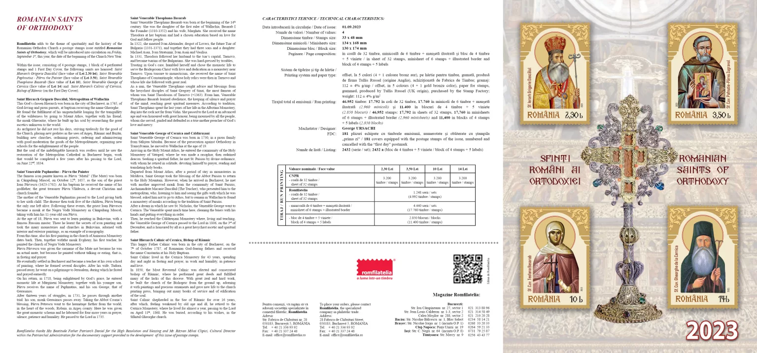 Romfilatelia adaugă tematicii spiritualității și istoriei Bisericii Ortodoxe Române o emisiune de mărci poștale intitulată Sfinți români ai Ortodoxiei, care va fi introdusă în circulație vineri, 1 septembrie a.c., data începerii Anului Nou bisericesc.