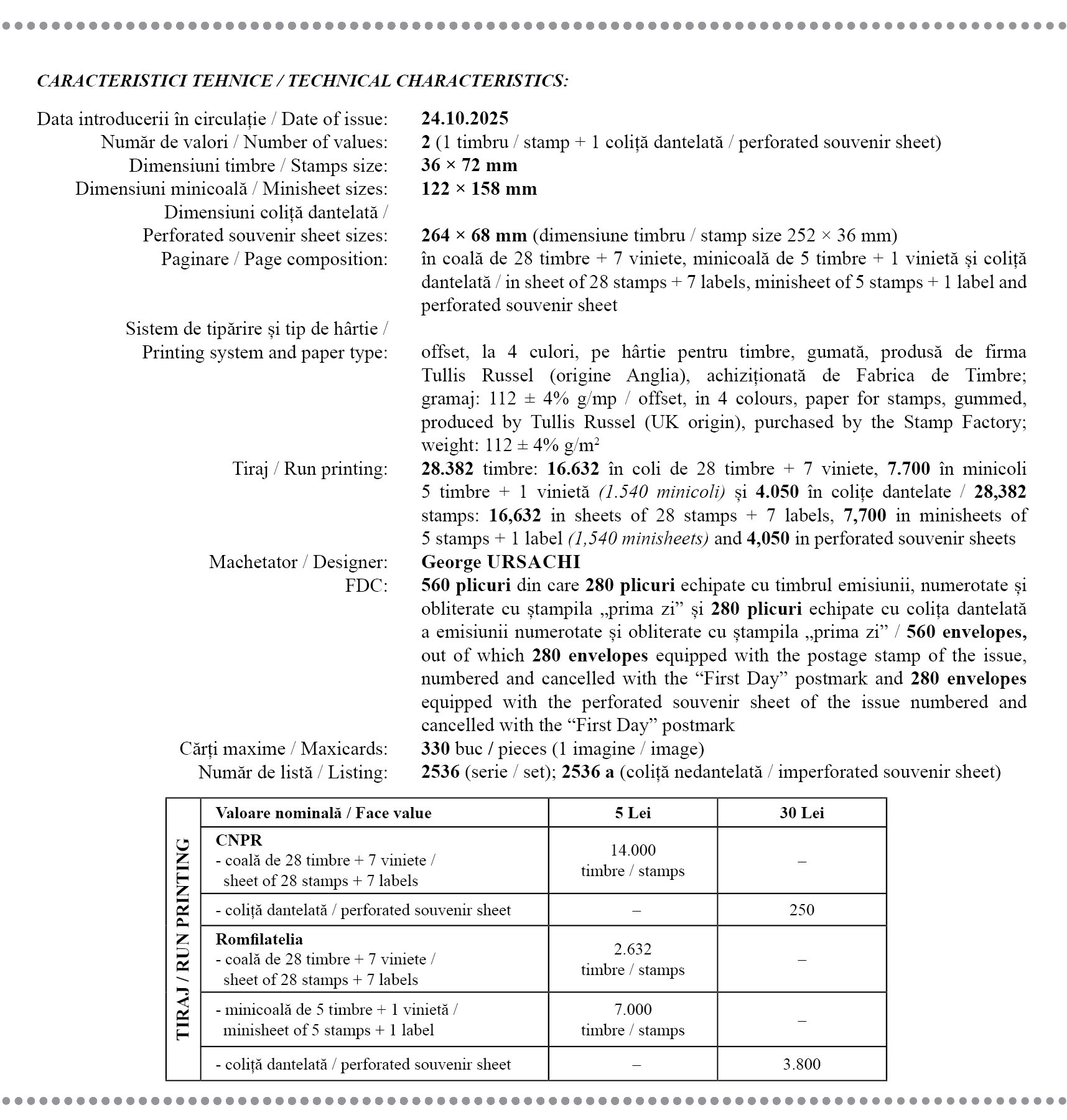 24 octombrie a.c. Emisiunea are în componența sa o marcă poștală, o coliță dantelată, două plicuri „prima zi” și o carte poștală maximă pentru pasionații de maximafilie.