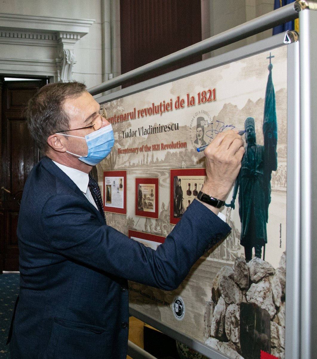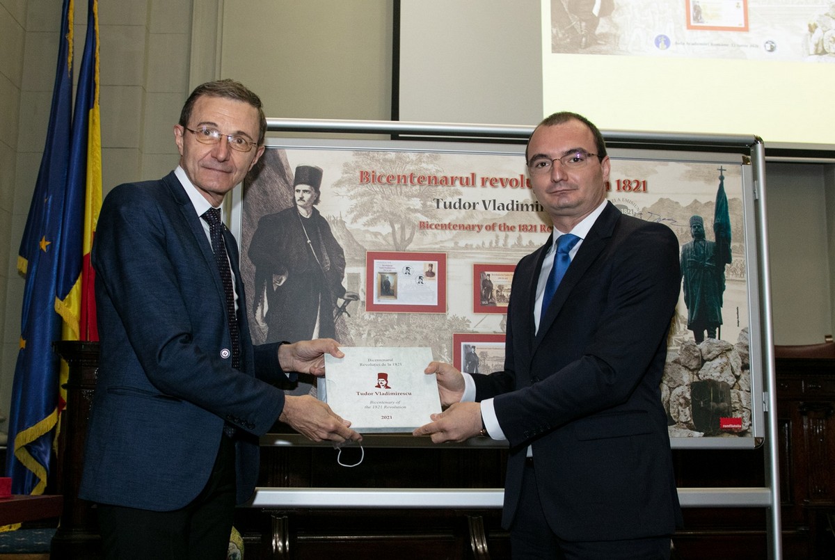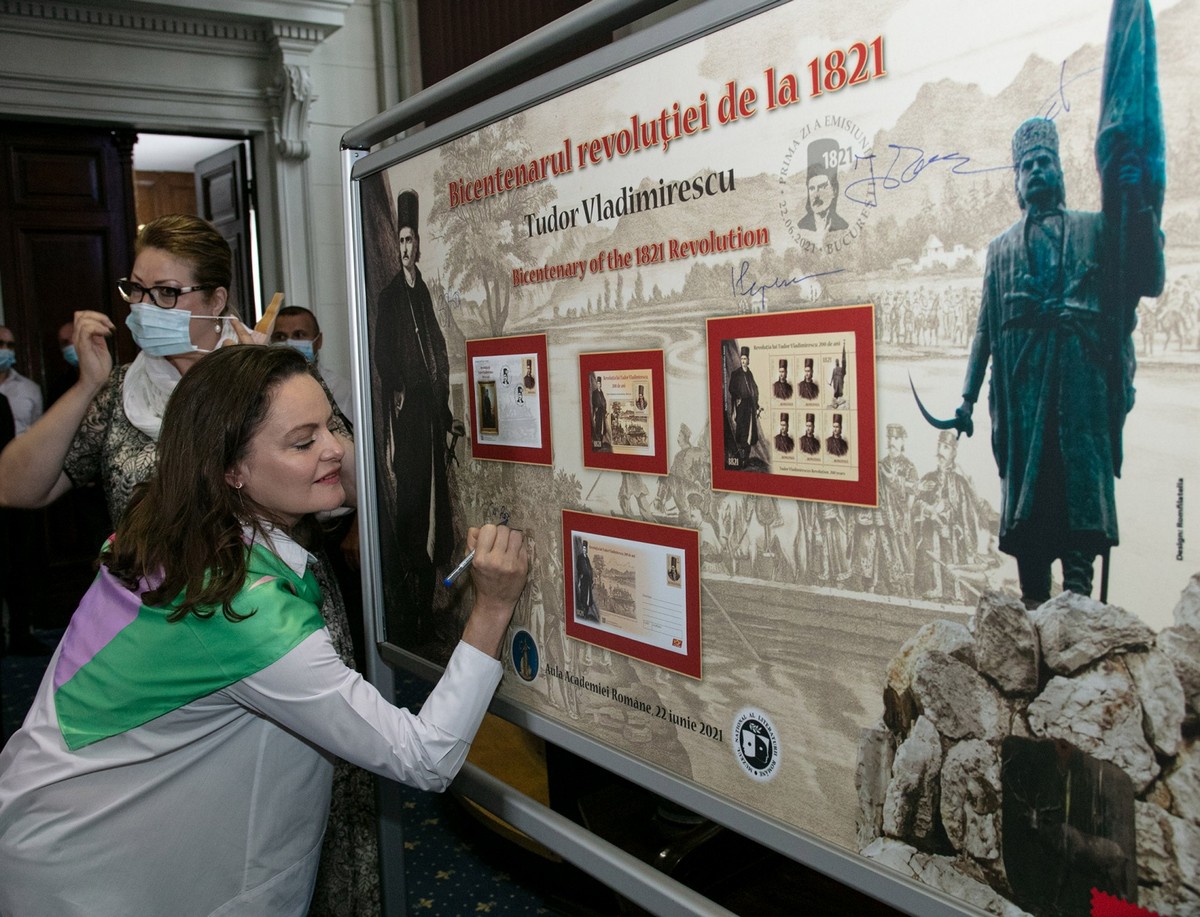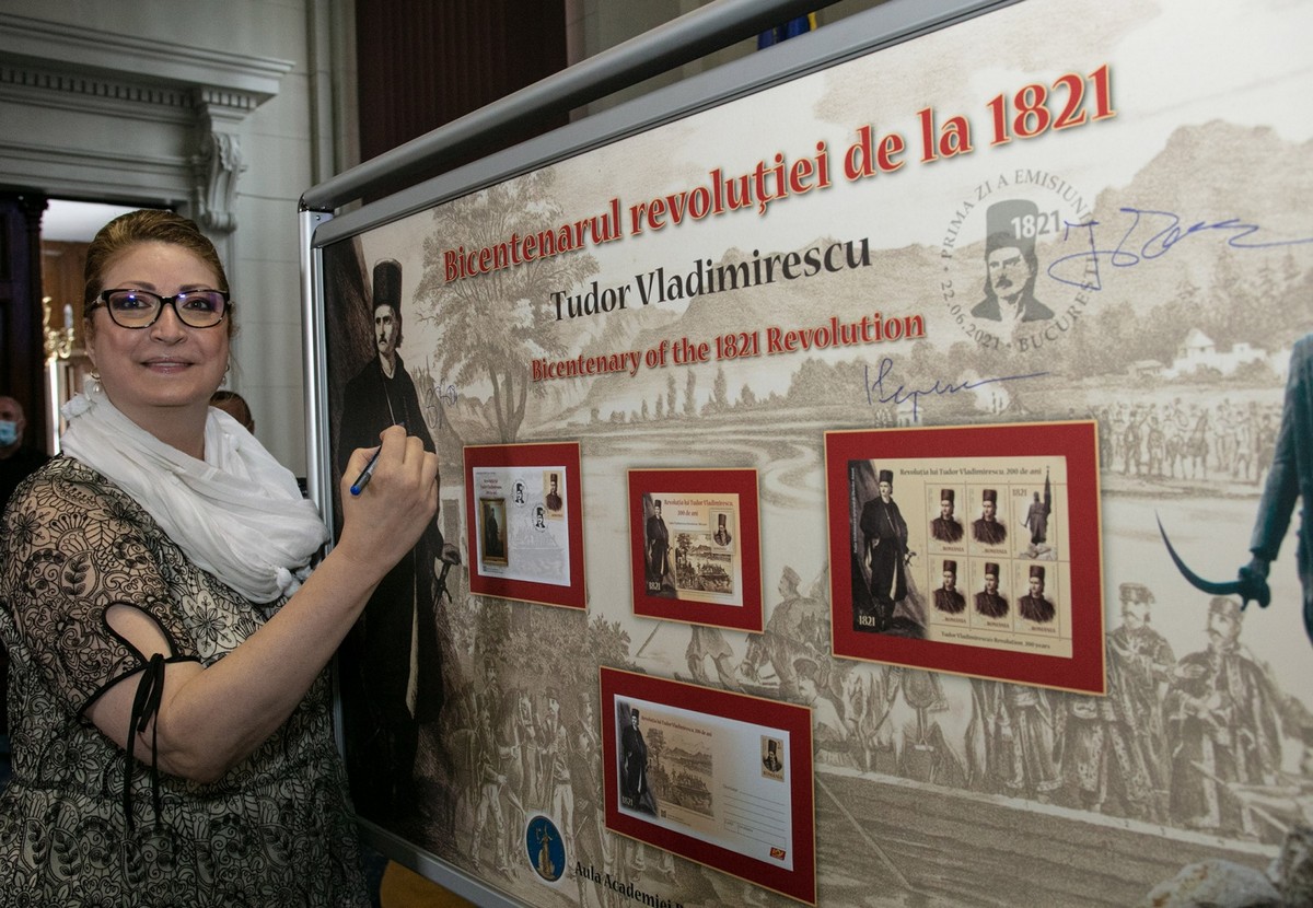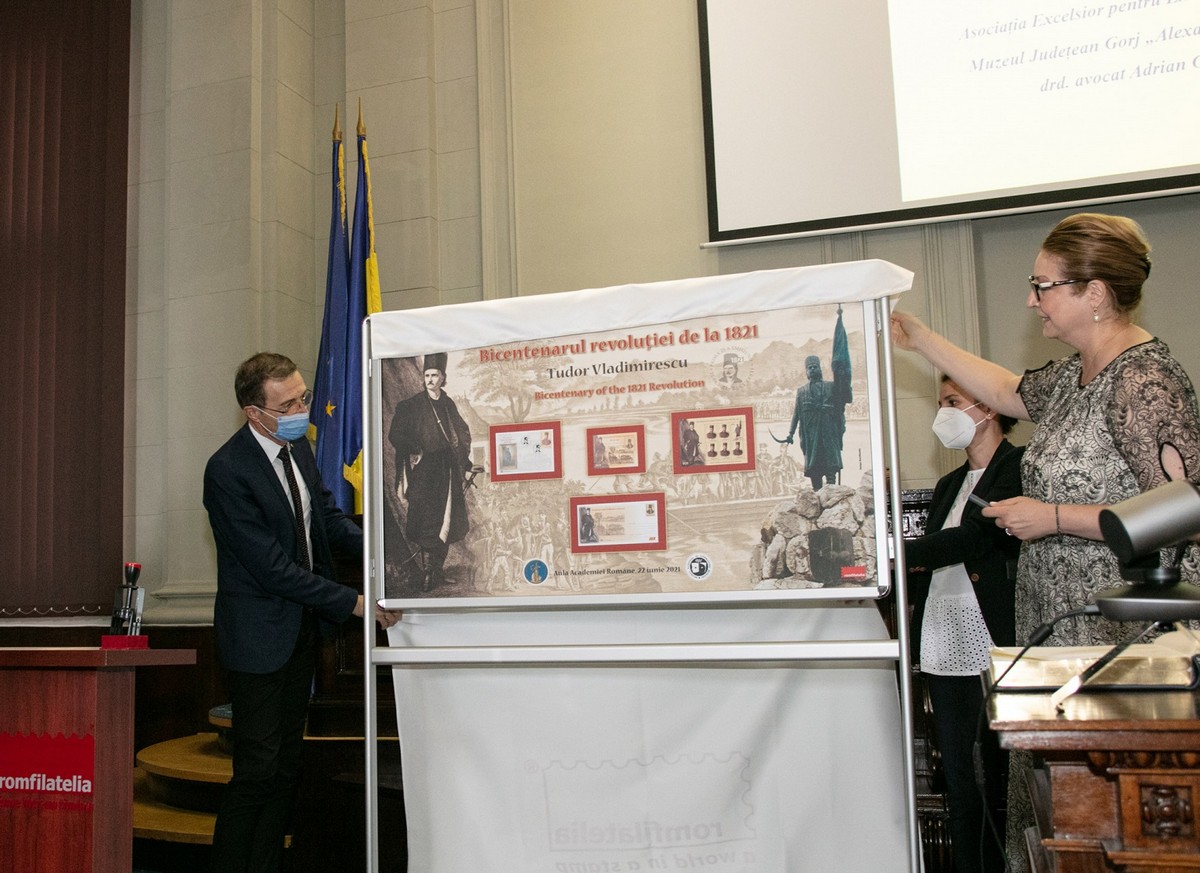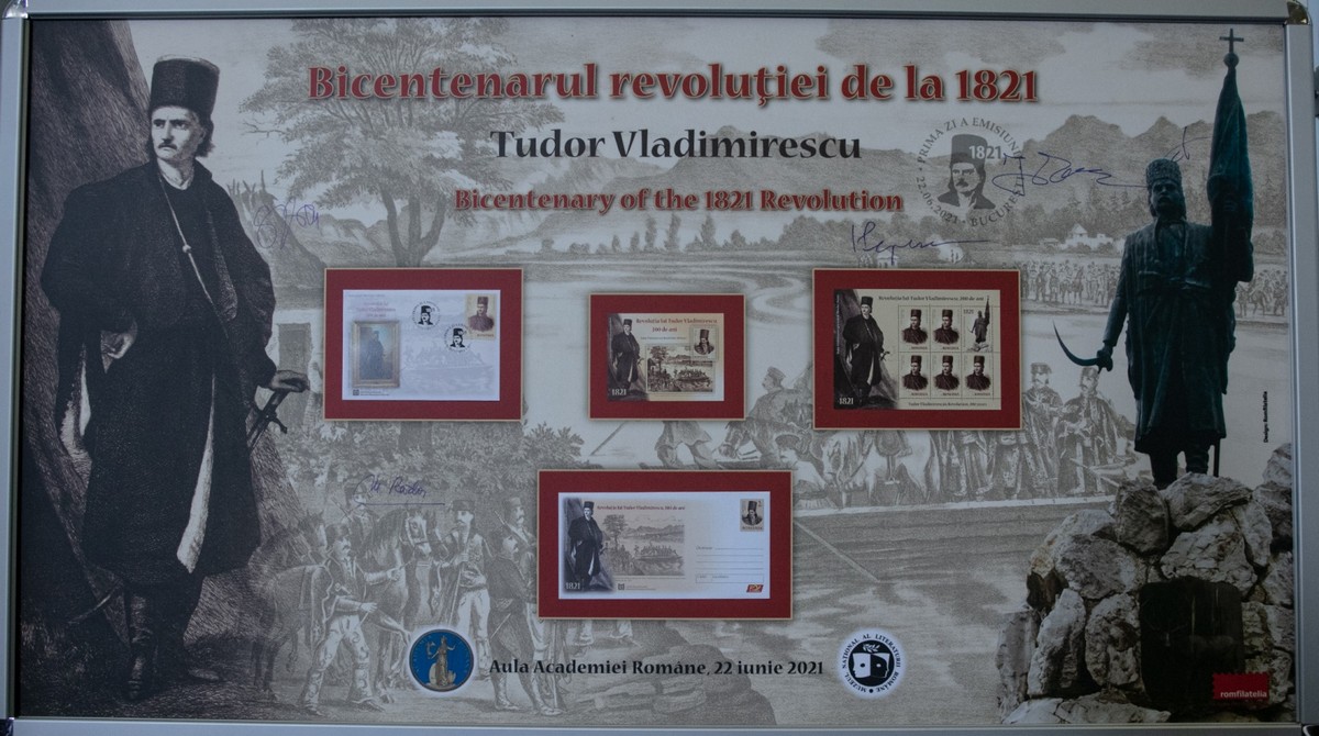 Directorul General Romfilatelia, Cristina Popescu, în discursul său, a prezentat elementele emisiunii de mărci poștale „Revoluția lui Tudor Vladimirescu, 200 de ani”, alcătuită dintr-o marcă poștală, o coliță dantelată, un bloc special aniversar și un plic „prima zi”, ce se înscrie în seria proiectelor menite să îl omagieze pe erou și să celebreze Anul Tudor Vladimirescu.