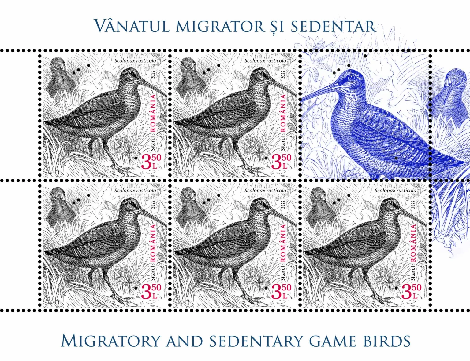 Sitarul de pădure – Scolopax rusticola, reprezentat pe primul timbru cu valoarea nominală de 3,50 lei, este o pasăre solitară, foarte bine camuflată prin culorile ruginii ale penajului, ca frunzele căzute pe sol. Sitarul poate fi observat în pădurile temperate și boreale din regiunea Palearctică.