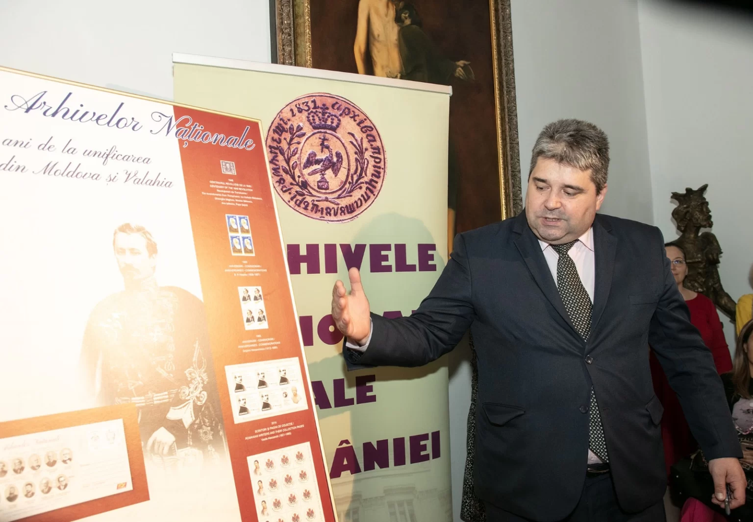 Un panou filatelic, conceput original Romfilatelia, a fost dezvelit și semnat de către conducerea instituției sărbătorite, etalând în suprafața lui, alături de o grafică explicativă, un plic special și mărci poștale dedicate unor mari personalități ale culturii care s-au aflat în anumite perioade la conducerea Arhivelor de Stat cum au fost: Ion Heliade Rădulescu, Grigore Alexandrescu, Vasile Alecsandri, Bogdan Petriceicu Hașdeu.