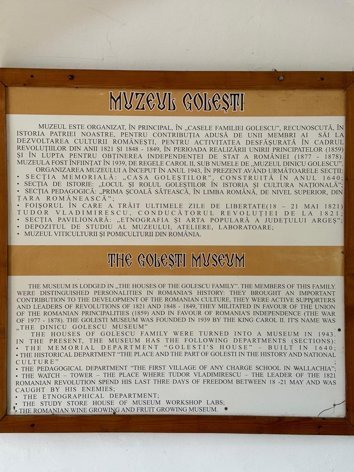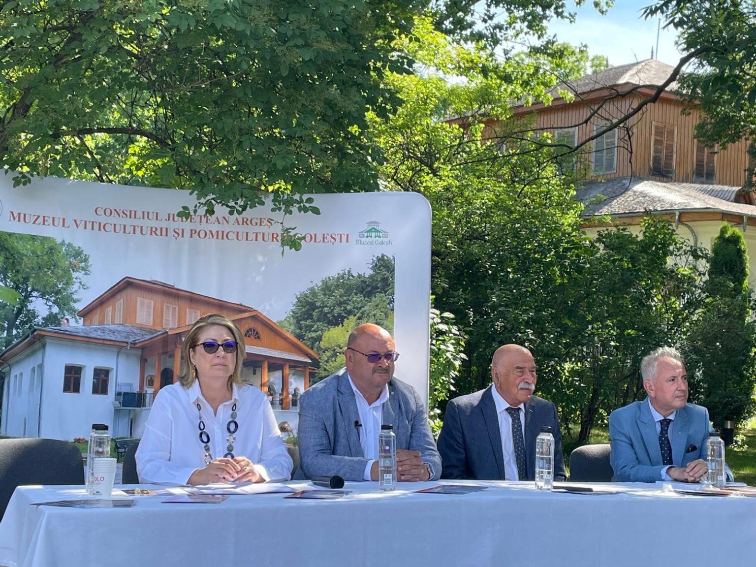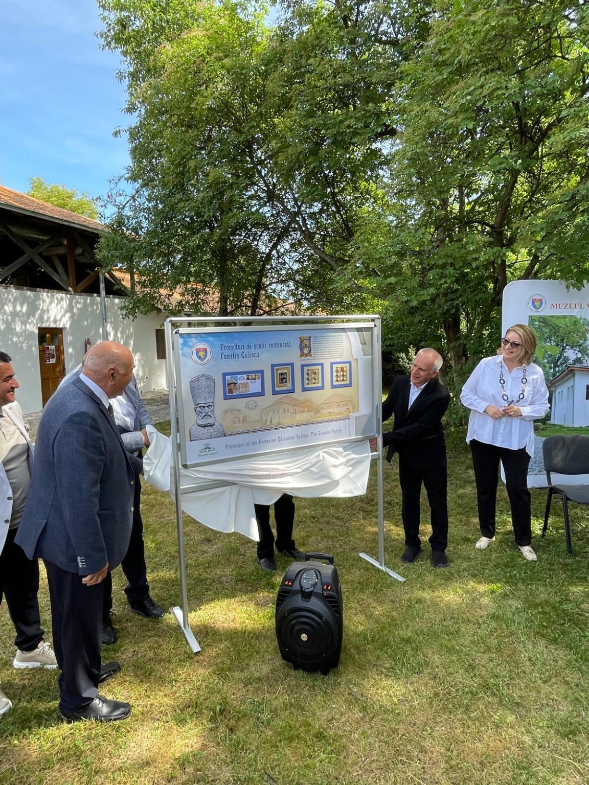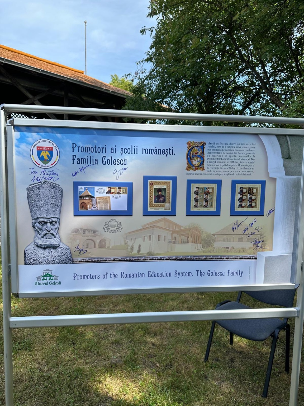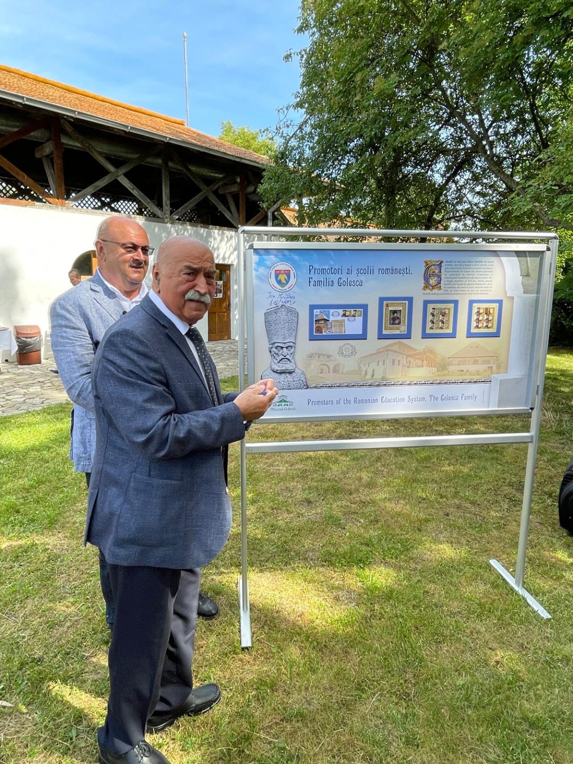Într-un loc marcat de istorie și intr un moment sărbătoresc motivat de împlinirea a 85 de ani de existență a unui muzeu care a purtat, de la înființarea lui de către Carol al II-lea (7 iunie 1939), numele cărturarului Dinicu Golescu, a avut loc prezentarea emisiunii de mărci poștale și lansarea albumului filatelic „Promotori ai școlii românești. Familia Golescu”. Amintiri despre filatelie, pasiunea de a colecționa timbre, au fost împărtășite de Președintele Consiliului Județean Argeș, Ion Mînzînă, Prof. univ. dr. Ioan Opriș, Directorul Muzeului, Narcis Iustin Dejanu, învitați, membri ai Inspectoratului școlar, ai administrației locale, reprezentanți ai domeniului cultural, prieteni. Prezenți la evenimentele istorice ale țării și în tezaurul culturii românești, cărturarii Goleștilor se regăsesc de acum în cea mai cunoscută și mirifică „lume a timbrelor”. Colița filatelică reproduce portretul marelui ban Radu Golescu, nedespărțit de pana și hârtia pentru scris, alături de un facsimil al Testamentului său, ca și mărcile poștale cu portretele lui Dinicu Golescu și Iordache Golescu, flancate de un facsimil al Testamentului său. Ansamblul muzeal istoric, un adevărat spațiu rural, conferă Muzeului Golești o semnificație națională și europeană, pe care am dorit să o sugeram în ansamblul artistic și grafic al panoului filatelic. Mulțumiri și felicitări domnului Ion Mînzînă, prieten al timbrului românesc, domnului Narcis Iustin Dejanu și echipei pentru sprijinul documentar. În apropierea Muzeului am putut admira Școala și Biserica din Golești, monument istoric construit în anul 1646 și care poartă Hramul Sfânta Treime. La mulți ani dascălilor, de ziua lor! La mulți ani Muzeului Golești! ❤️🇷🇴