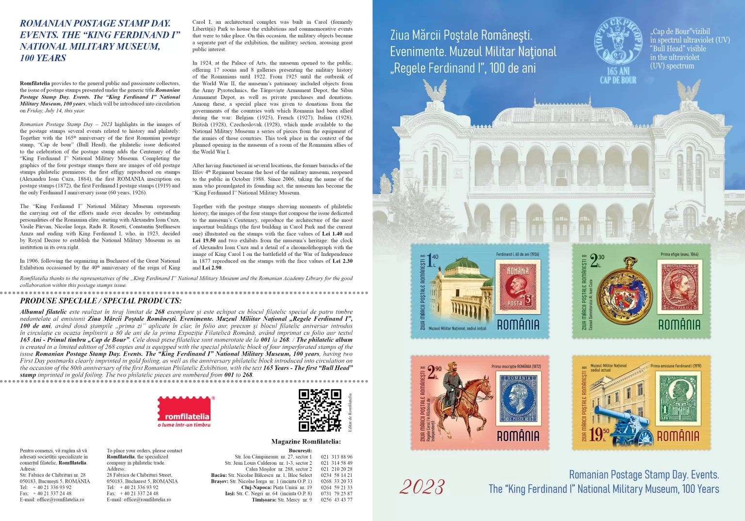 Ziua Mărcii Poștale Românești – 2023 evidențiază în imaginile mărcilor poștale mai multe evenimente legate de istorie și filatelie: Alături de împlinirea a 165 de ani de la apariția primului timbru românesc, „Cap de bour”, emisiunea filatelică dedicată sărbătorii mărcii poștale adaugă Centenarul Muzeului Militar Național „Regele Ferdinand I”. Completând grafica celor patru timbre, se regăsesc imagini ale unor mărci poștale vechi, premiere filatelice: prima efigie reprodusă pe timbre (Alexandru Ioan Cuza, 1864), prima inscripționare ROMÂNIA pe mărcile poștale (1872), primele mărci poștale Ferdinand I (1919) și unica emisiune aniversară Ferdinand I (60 de ani, 1926).