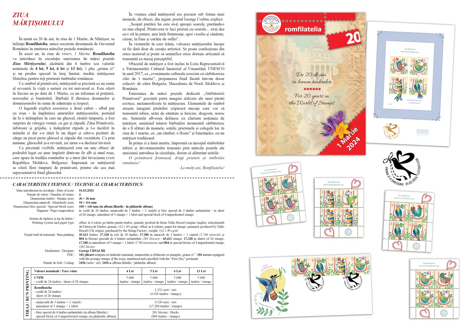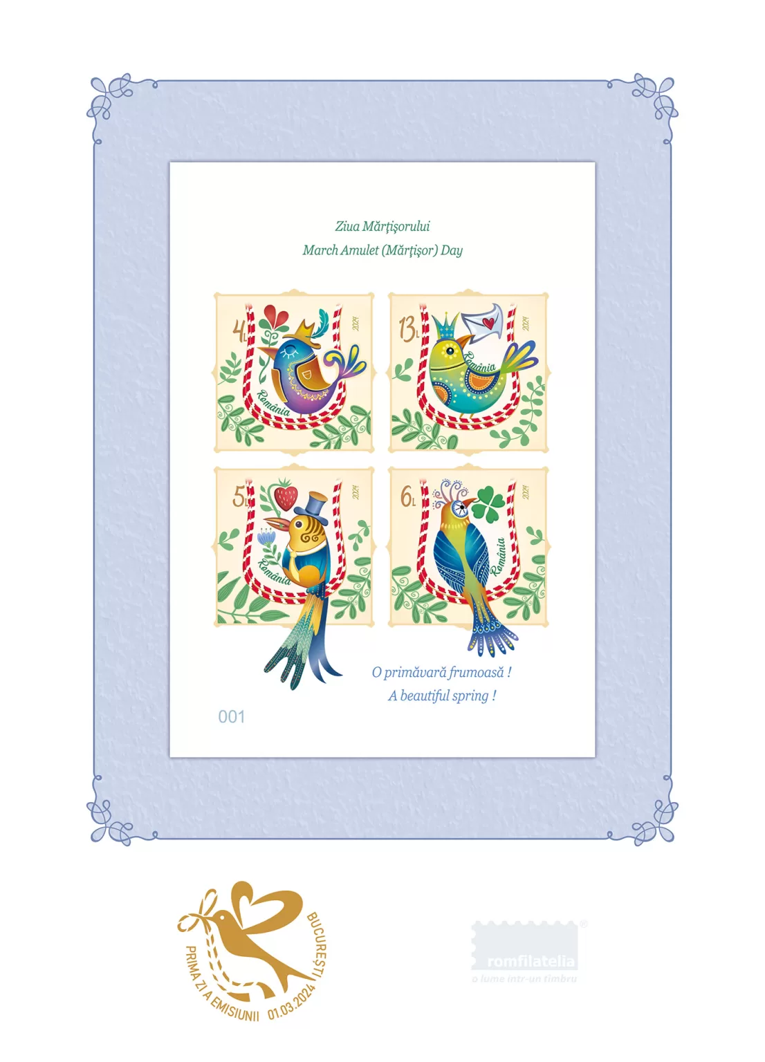 Emisiunea de mărci poștale dedicată ,,Sărbătoririi Primăverii” prezintă patru imagini stilizate ale unor păsări exotice, metamorfozate în mărțișoare. Elementele de simbol atașate imaginii păsărilor criptează mesaje care vor să transmită iubire, urări de sănătate și fericire, dragoste, noroc etc. Șnururile alb-roșu definesc cu claritate noțiunea de mărțișor, amintind tuturor bărbaților momentul sărbătoresc de a fi alături de mamele, soțiile, prietenele și colegele lor, în ziua de 1 martie, cu ,,un zâmbet, o floare” și bineînțeles, cu un mărțișor tradițional.