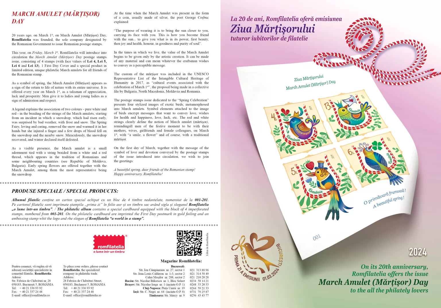 În acest an, în ziua de vineri, 1 Martie, Romfilatelia va introduce în circulație emisiunea de mărci poștale Ziua Mărțișorului, alcătuită din 4 timbre (cu valorile nominale de 4 lei, 5 lei, 6 lei și 13 lei), 1 plic „prima zi” și un produs special în tiraj limitat, inedite mărțișoare filatelice pentru toți prietenii timbrului românesc.